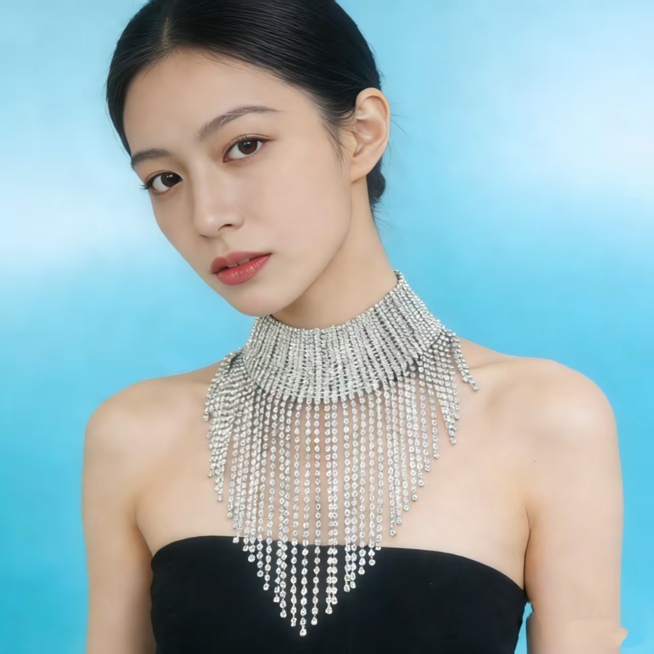 This choker is adorned with delicate, shimmering crystal tassels that sway gracefully with every movement, creating a captivating and eye-catching look. The classic fringe silhouette perfectly accentuates the neckline and adds a touch of glamour to any outfit.