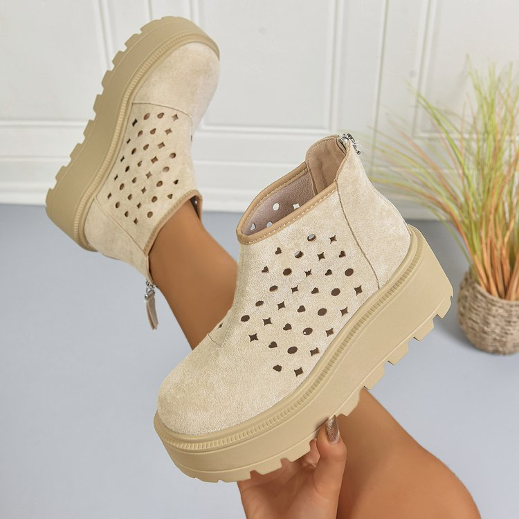 Elevate your warm-weather style with these trendy perforated platform ankle boots. Featuring a breathable cutout upper, a chunky lug sole for subtle height, and a convenient back zipper closure, these suede booties blend casual comfort with bold fashion. Perfect for summer outings, daily commutes, or casual weekends, they offer a lightweight, airy feel while keeping your look on-trend.