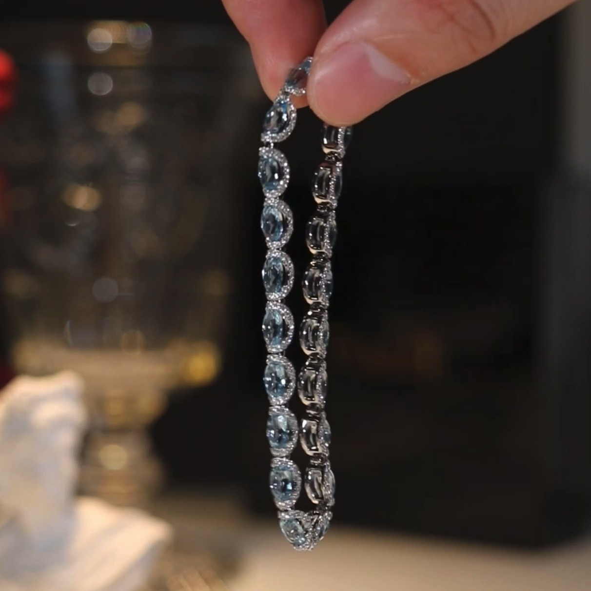 Oval Aquamarine Halo Tennis Bracelet, Luxury Blue Gem Bracelet For Women