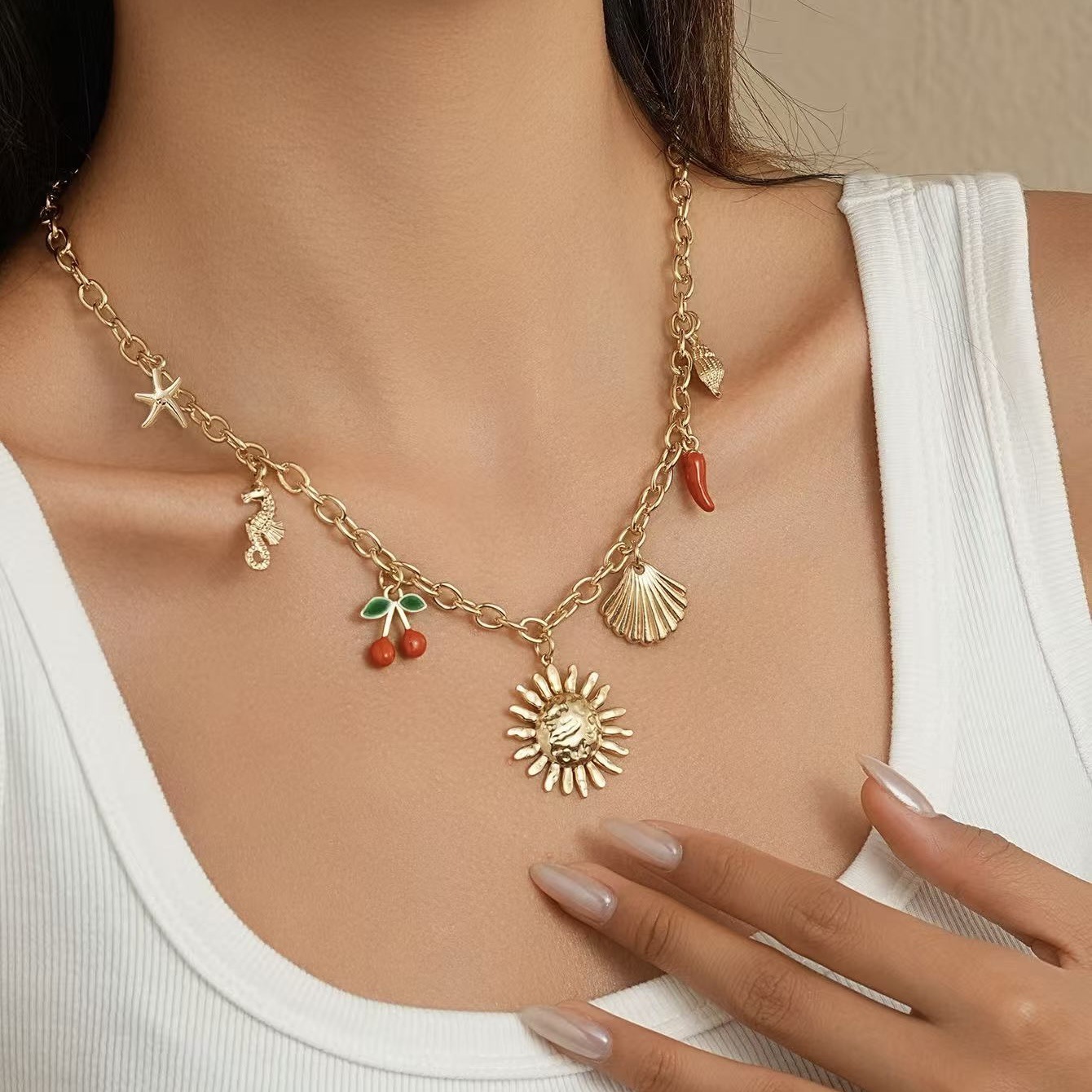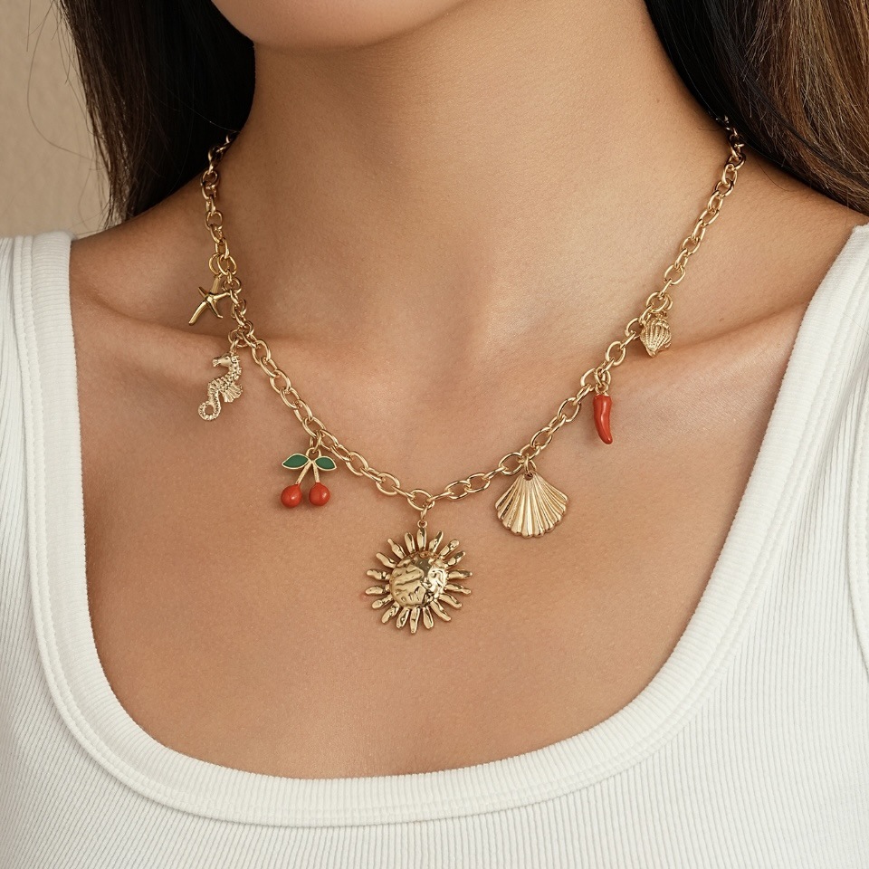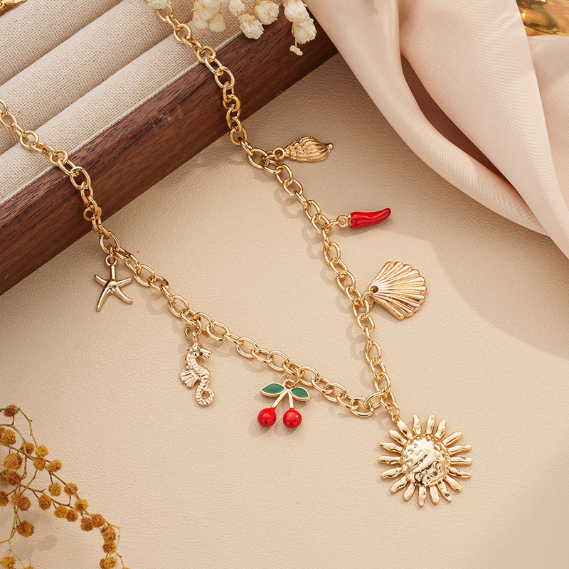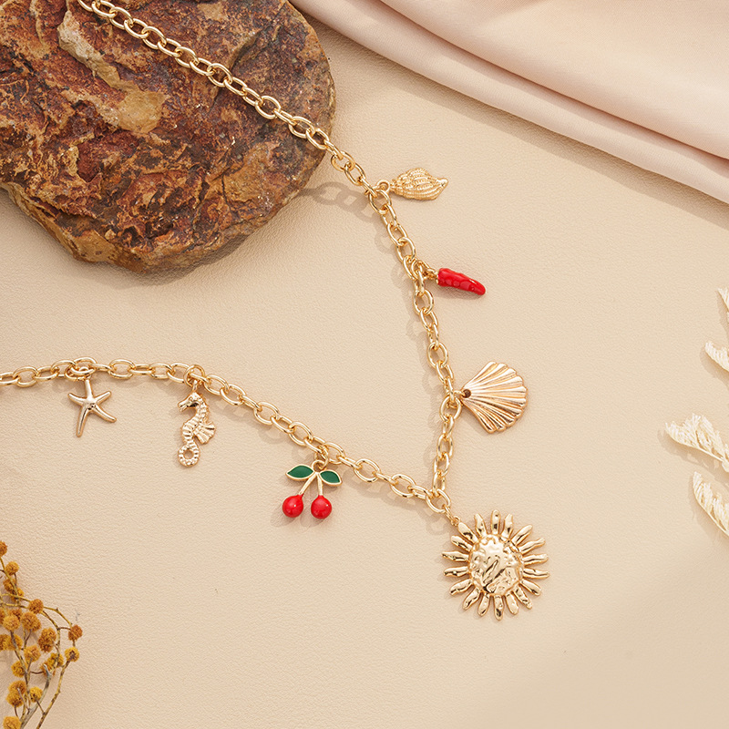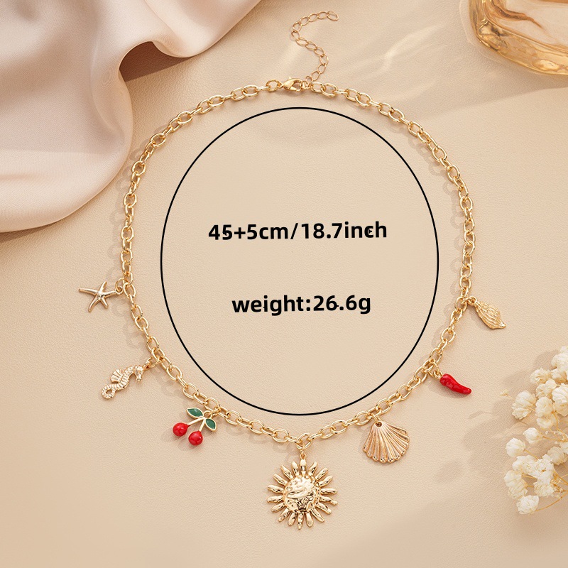 Women's Summer Starfish Necklace With Sun, Shell, Seahorse Cherry Charms Multi-Element Pendant Jewelry