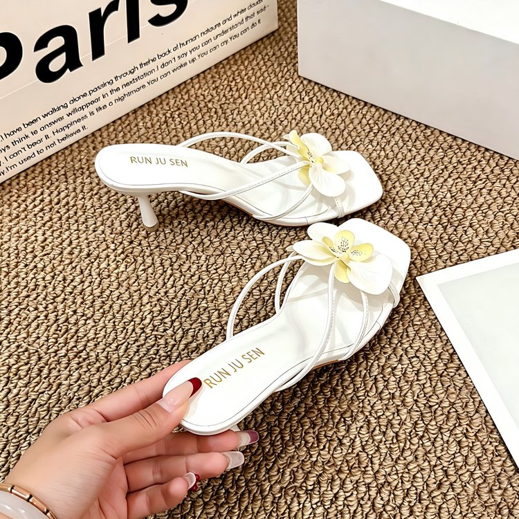 Fashionable Niche Flower Slippers, Comfortable Square Toe, Exposed Toe, Cool Drag, Thick Heel, Half Drag High Heels