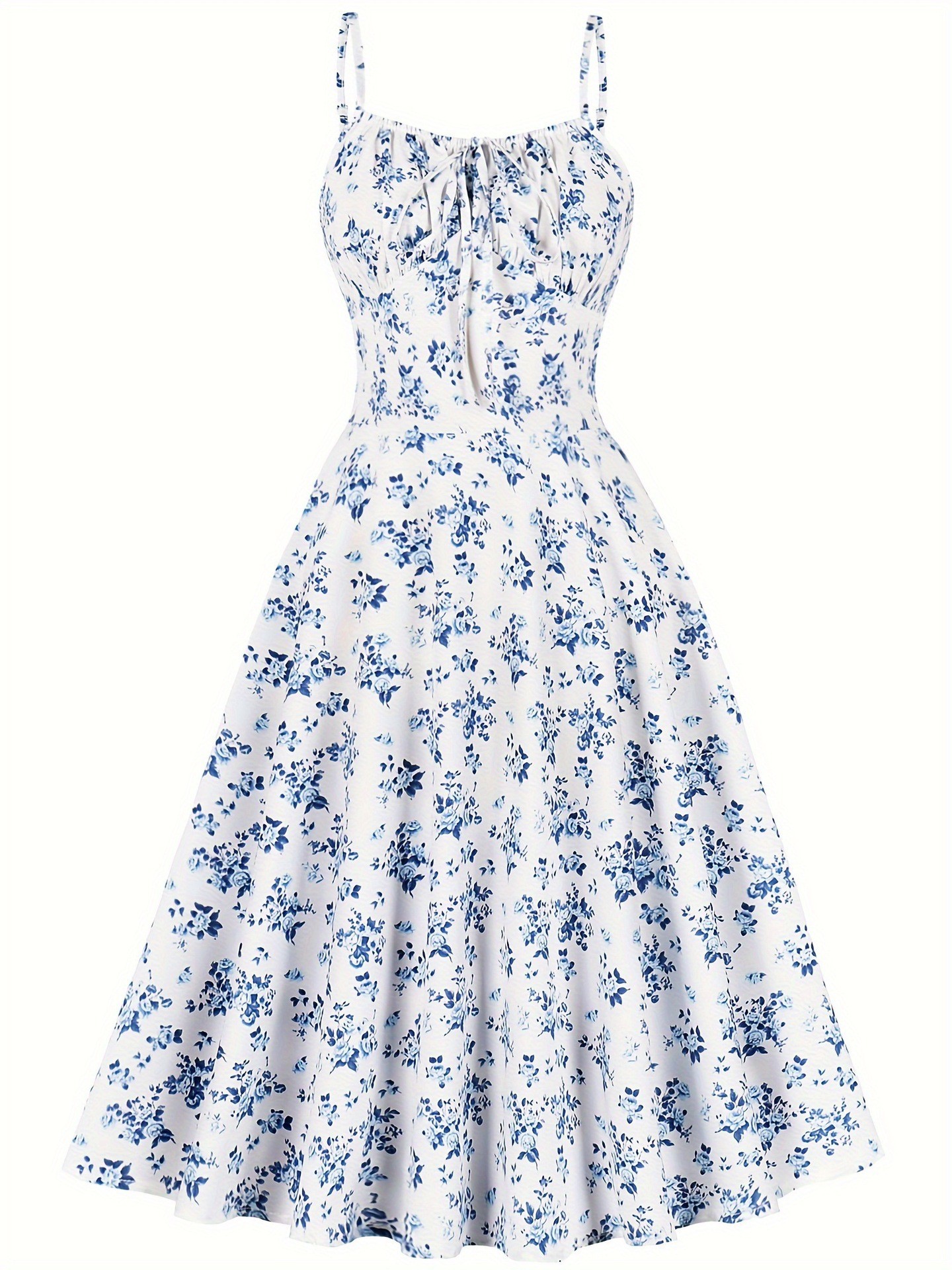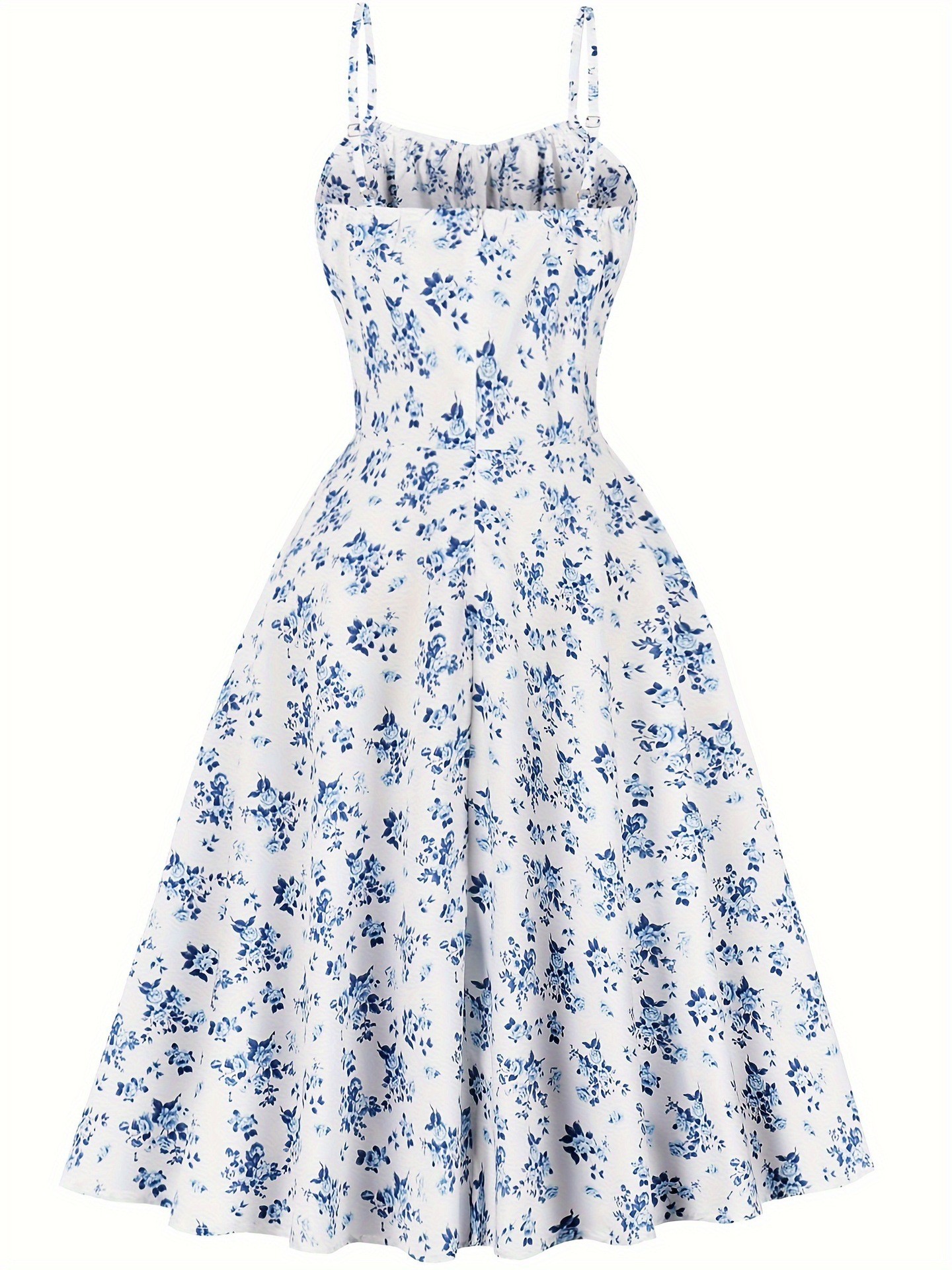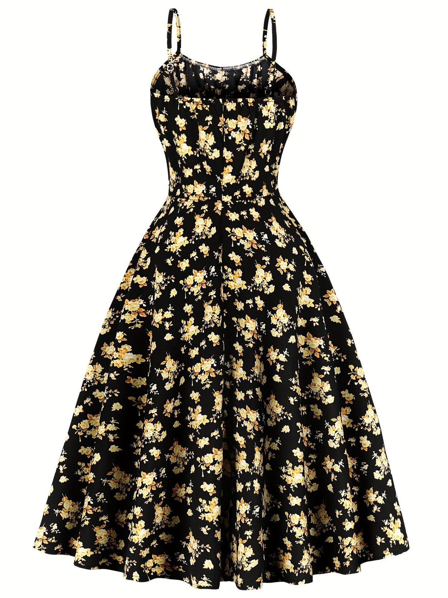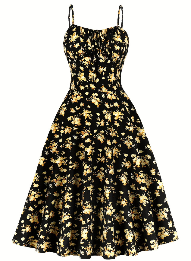 Features: Floral print, A-line silhouette, midi length, open-back design, spaghetti straps, sleeveless