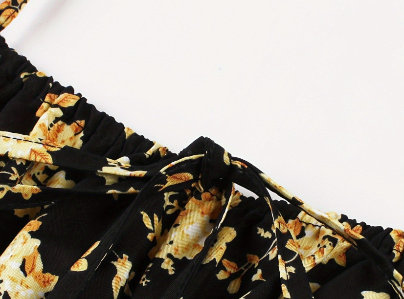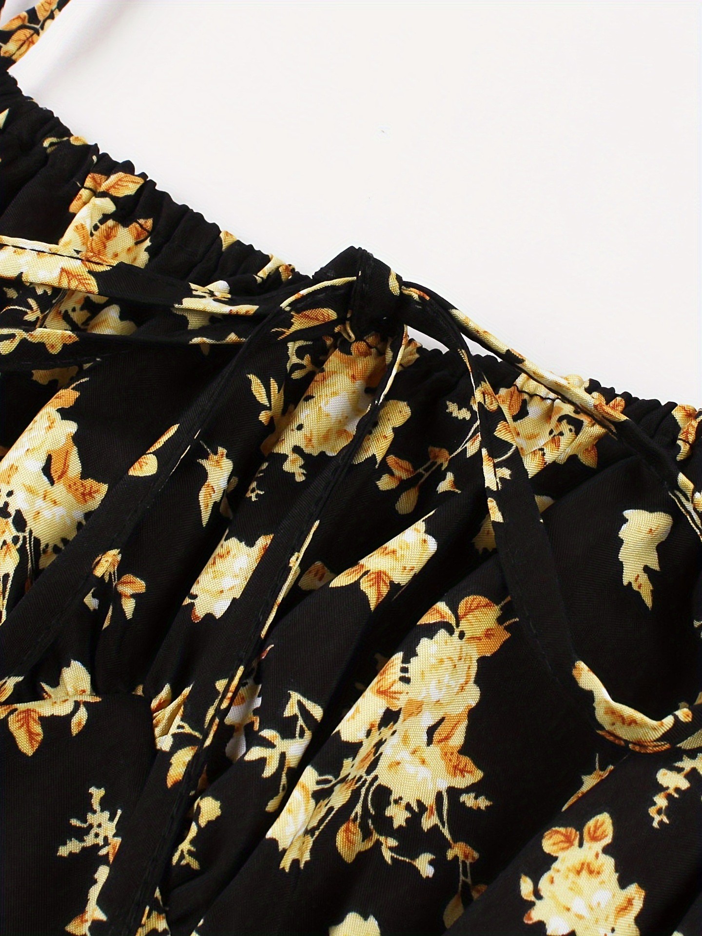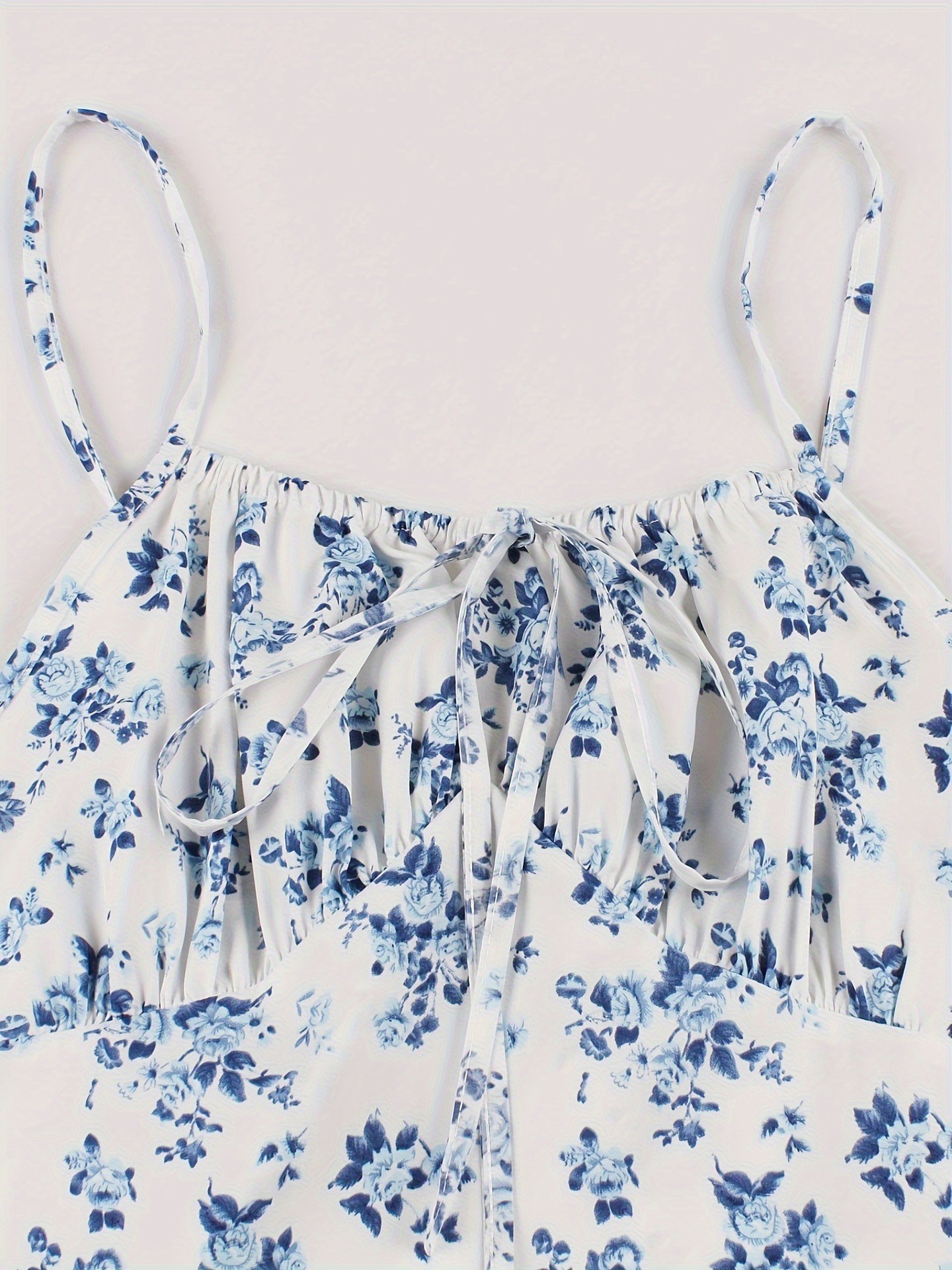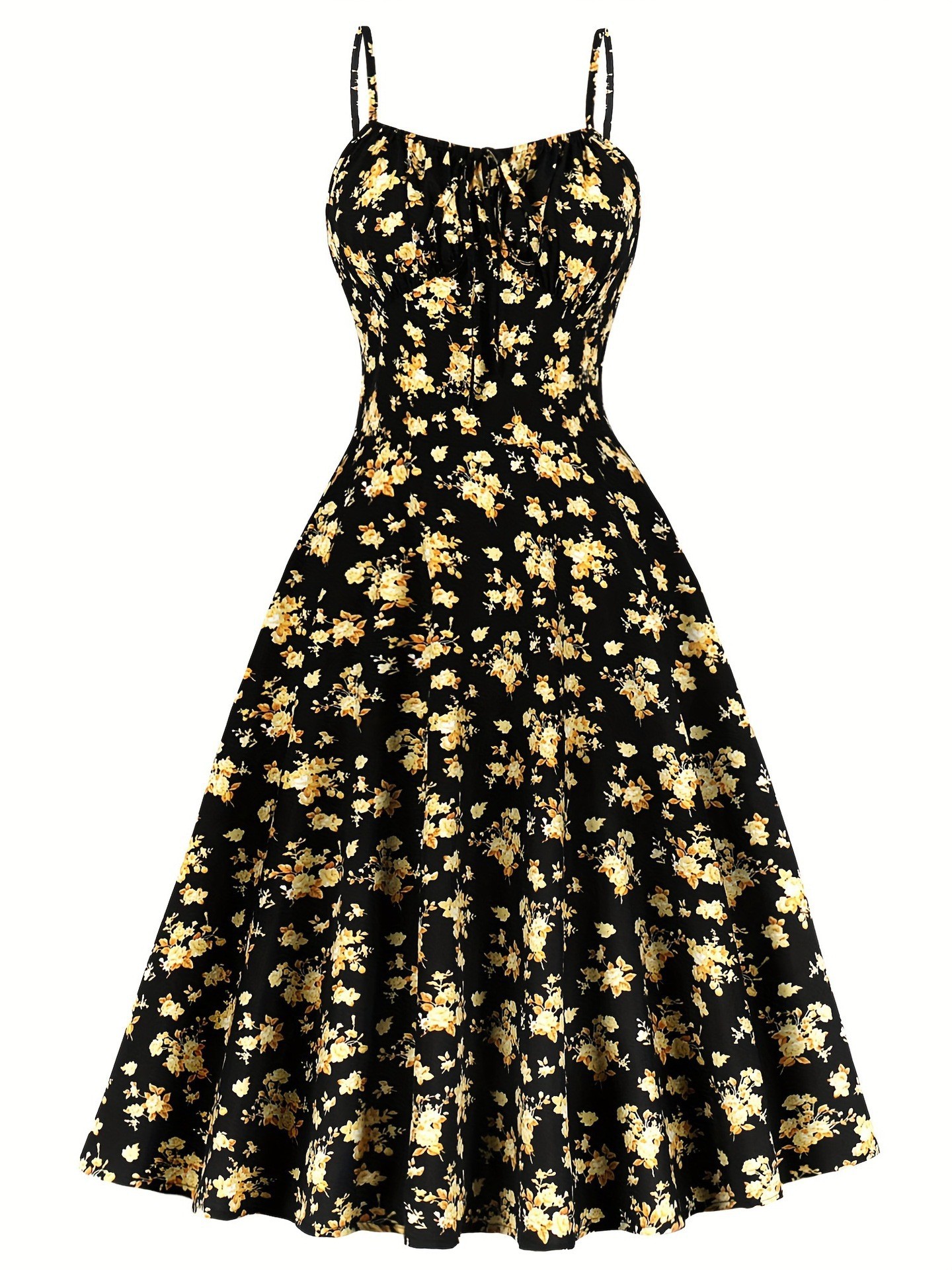 Features: Floral print, A-line silhouette, midi length, open-back design, spaghetti straps, sleeveless