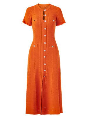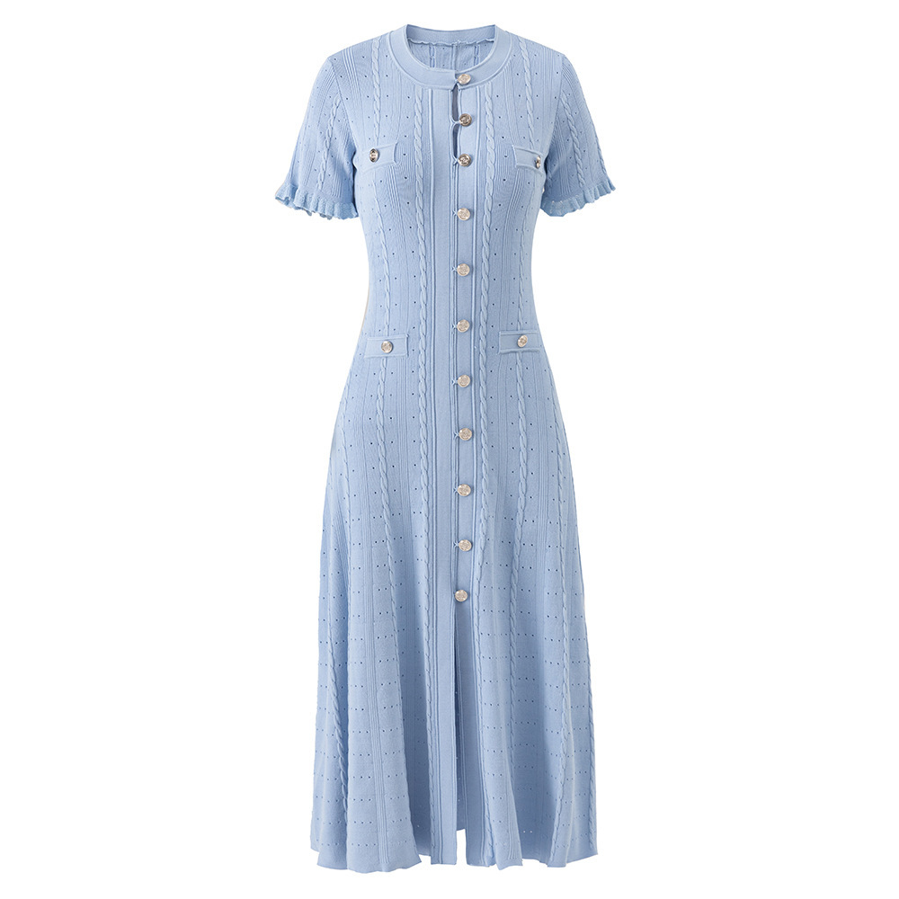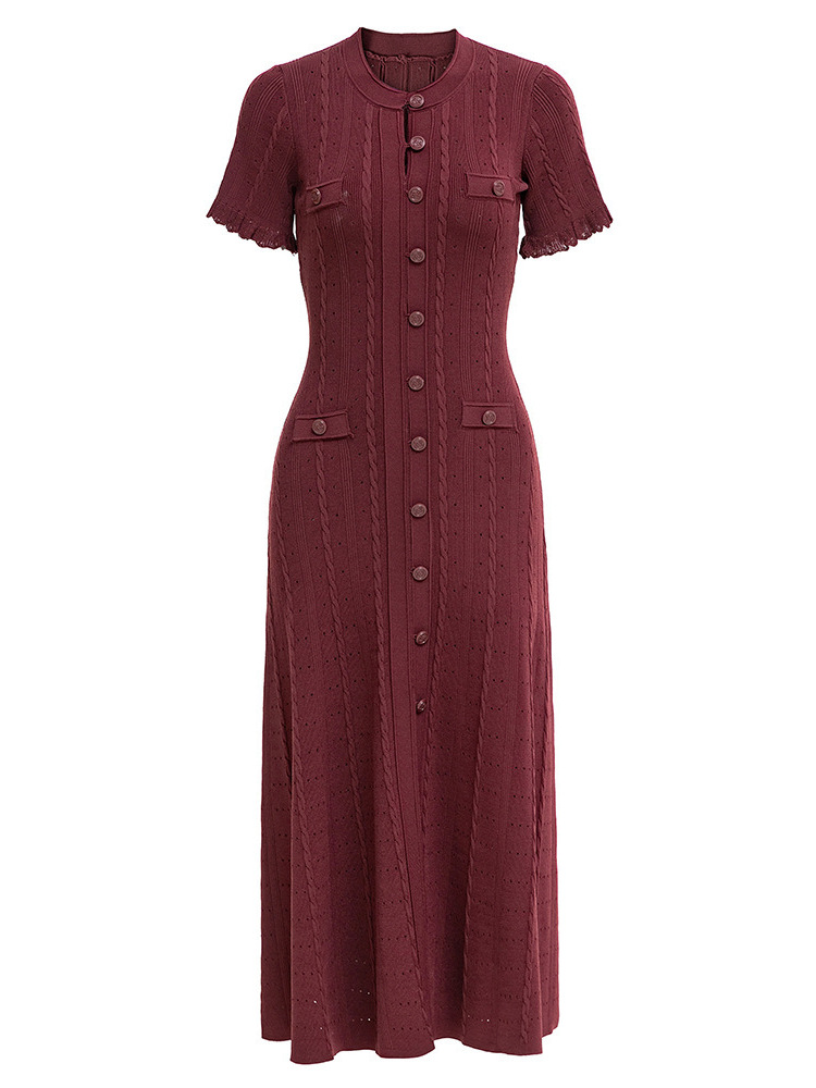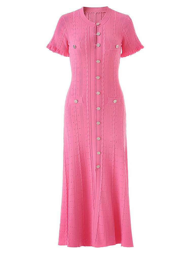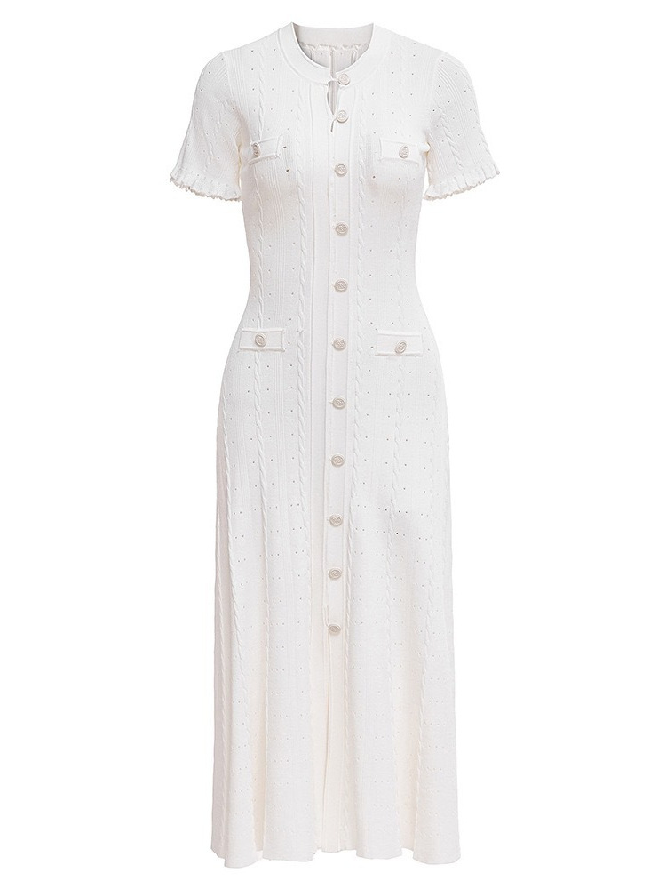 Features: High-waisted A-line maxi dress with single-button front closure, side slit, defined waistline, minimalist design, and wrinkle-resistant finish