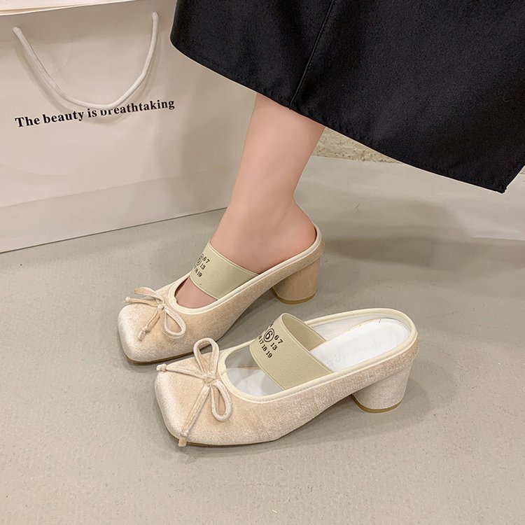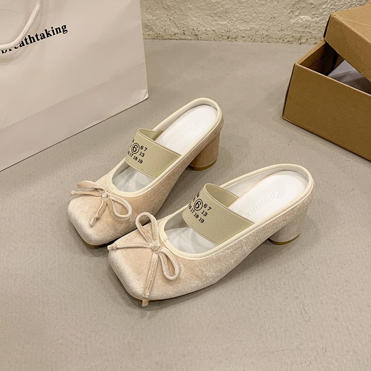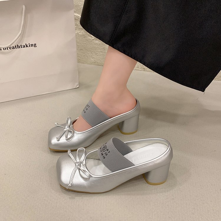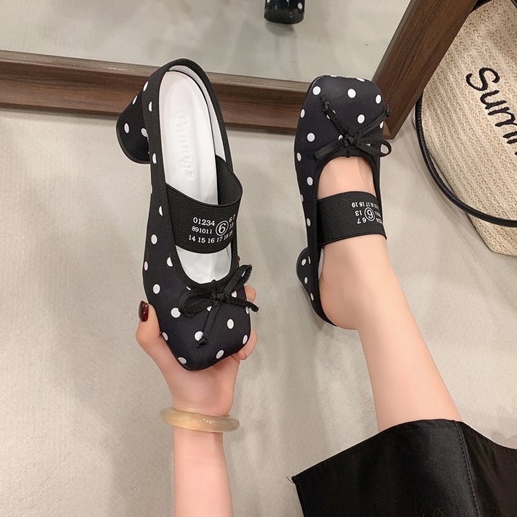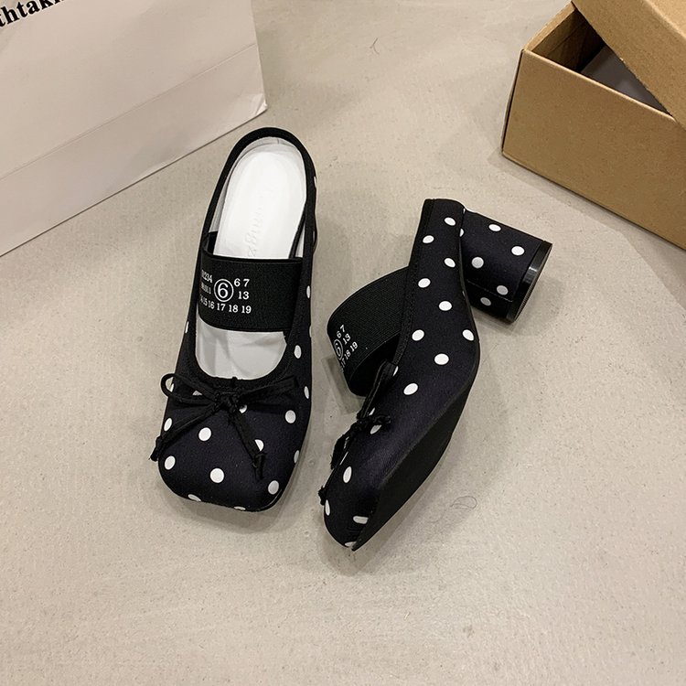 French Retro Bow Mary Jane Shoes With Toe Caps, Half Drag Ballet High Heels, Women's Casual Thick Heels