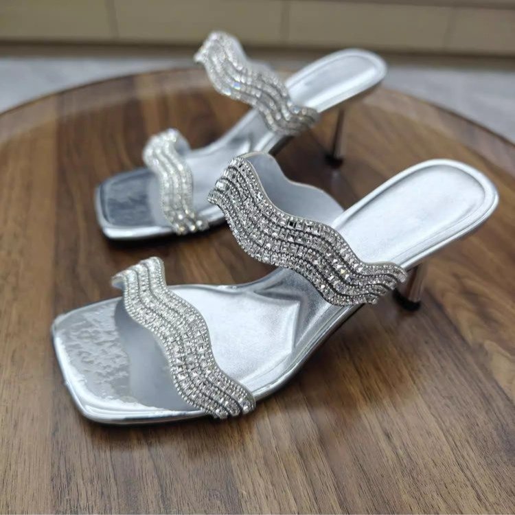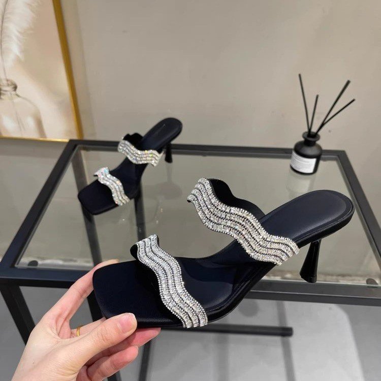 Water Diamond Straight Strap Slippers For Women, High Heels, Cool Slippers, Fashionable