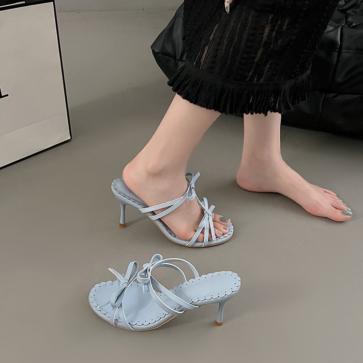 Butterfly Knot Slim Heeled Sandals For Women, Versatile And Showcasing A White Temperament. One And A Half Drag French Style Open Toed High Heels