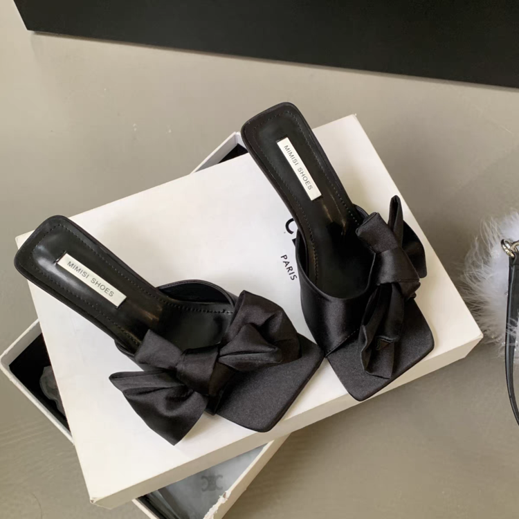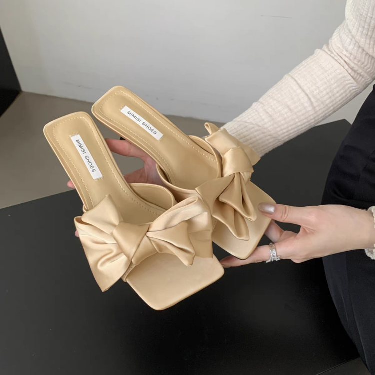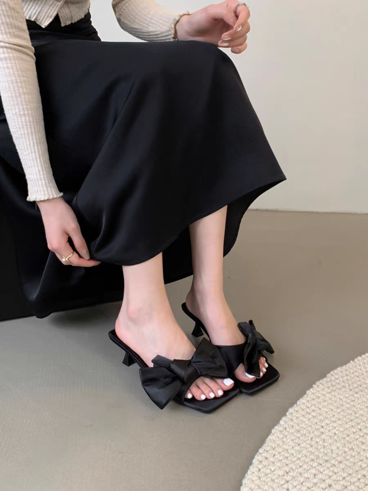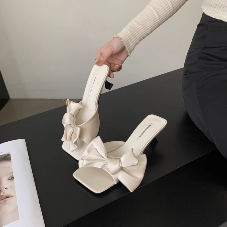 Fairy Style Square Bow Bow One Line Slippers For Women, Slim Heels With Exposed Toes, High Heels, Cool Slippers