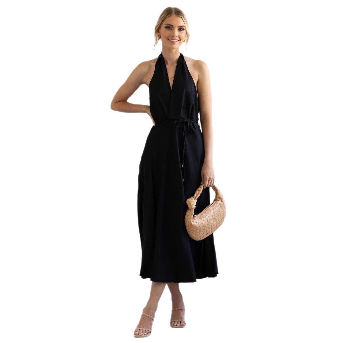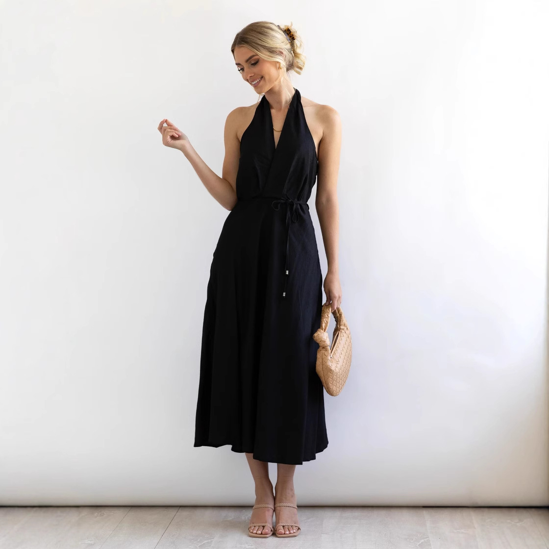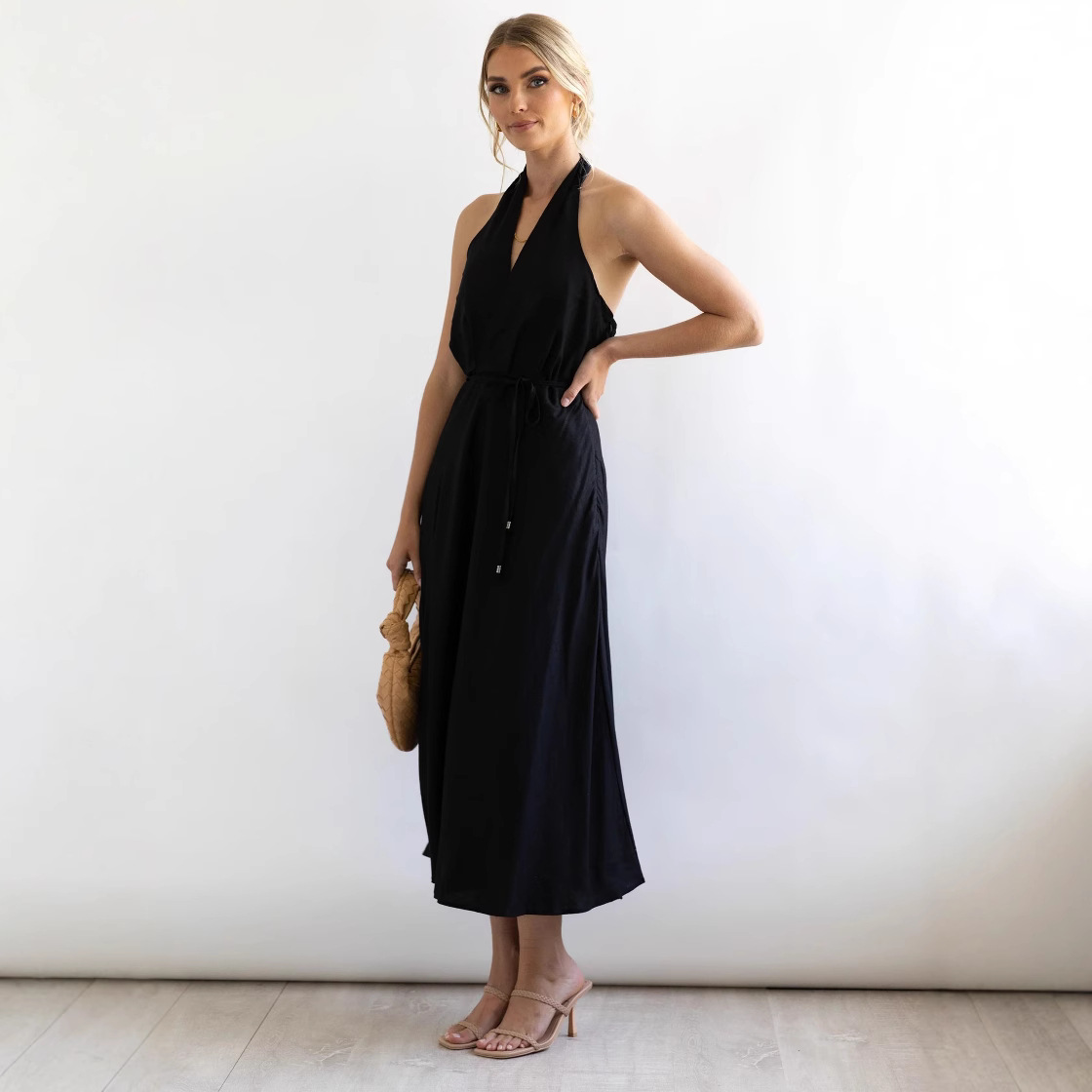 Features: A-line silhouette, midi length, sleeveless, halter neck with open back design, loose waist, tie detail, patchwork craftsmanship