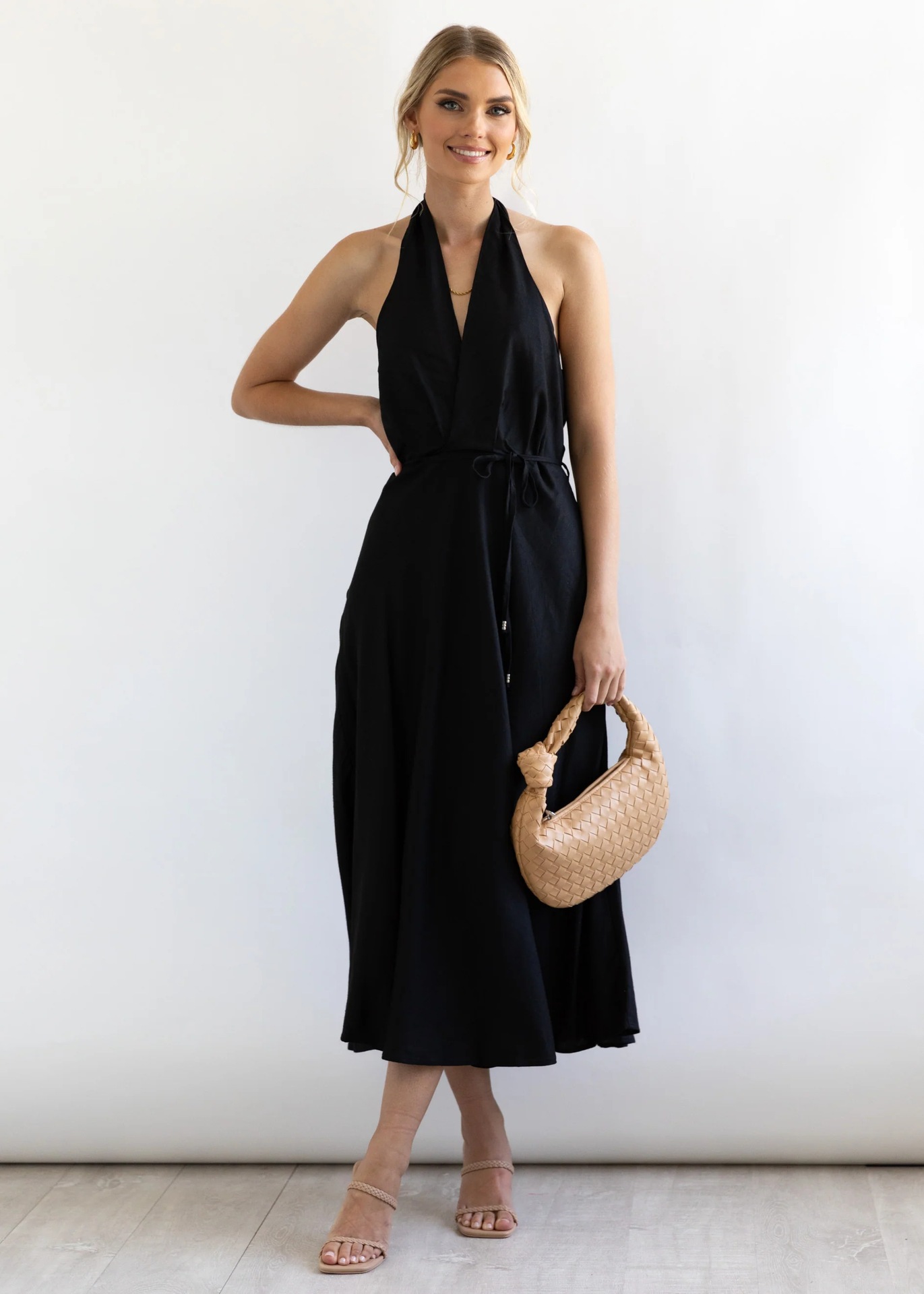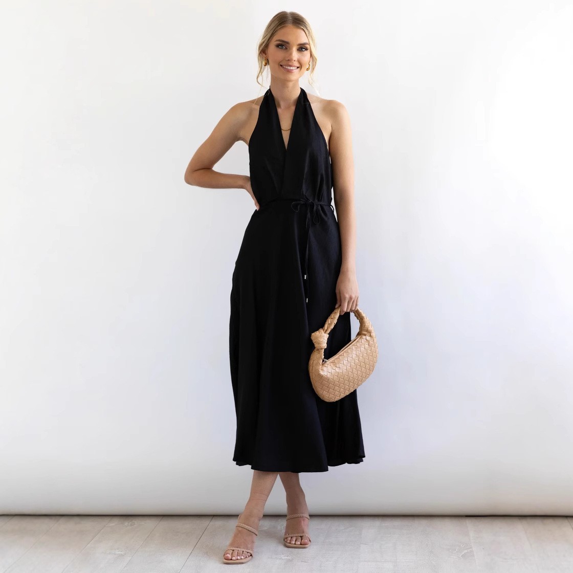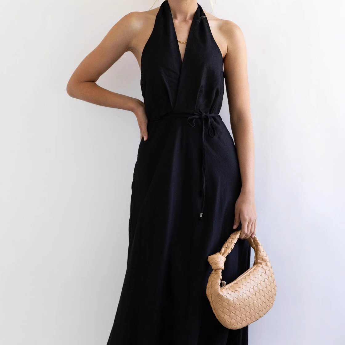 Features: A-line silhouette, midi length, sleeveless, halter neck with open back design, loose waist, tie detail, patchwork craftsmanship