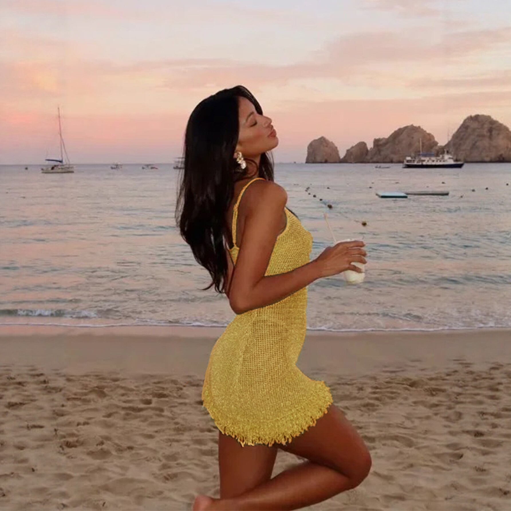 Product information:Material: Acrylic Style: Japanese/Korean casual, resort vibe Features: Hollow-out knit, tassel details, thin shoulder straps, sleeveless Colors: Yellow, olive, deep pink, sky blue Sizes: XS, S, M, L