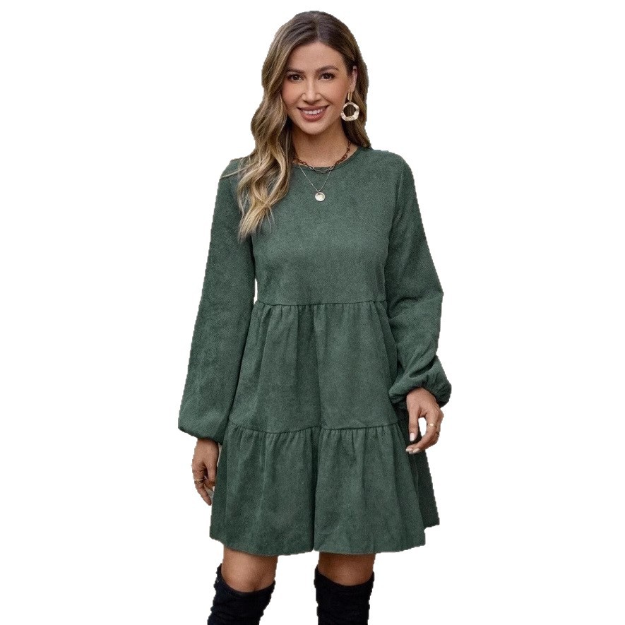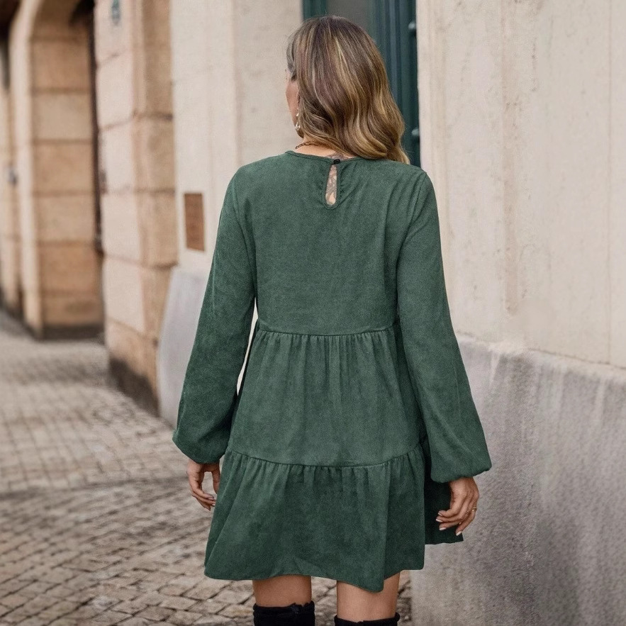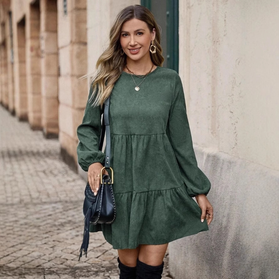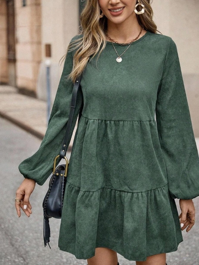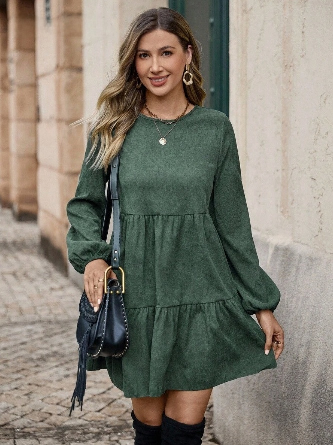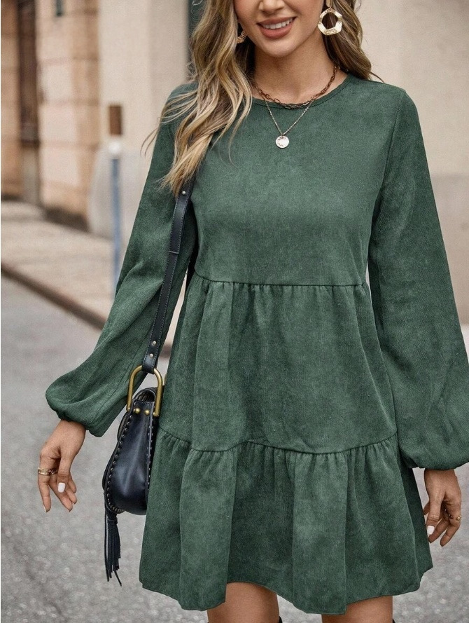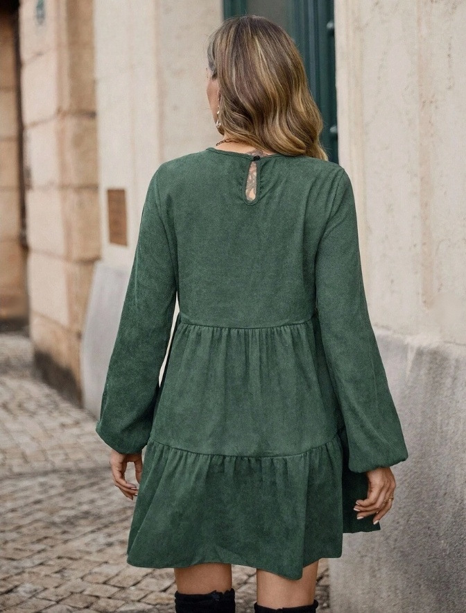 Features: A-line silhouette, flared hem, midi length, mid-rise waist, round neck with long sleeves, quilted detailing