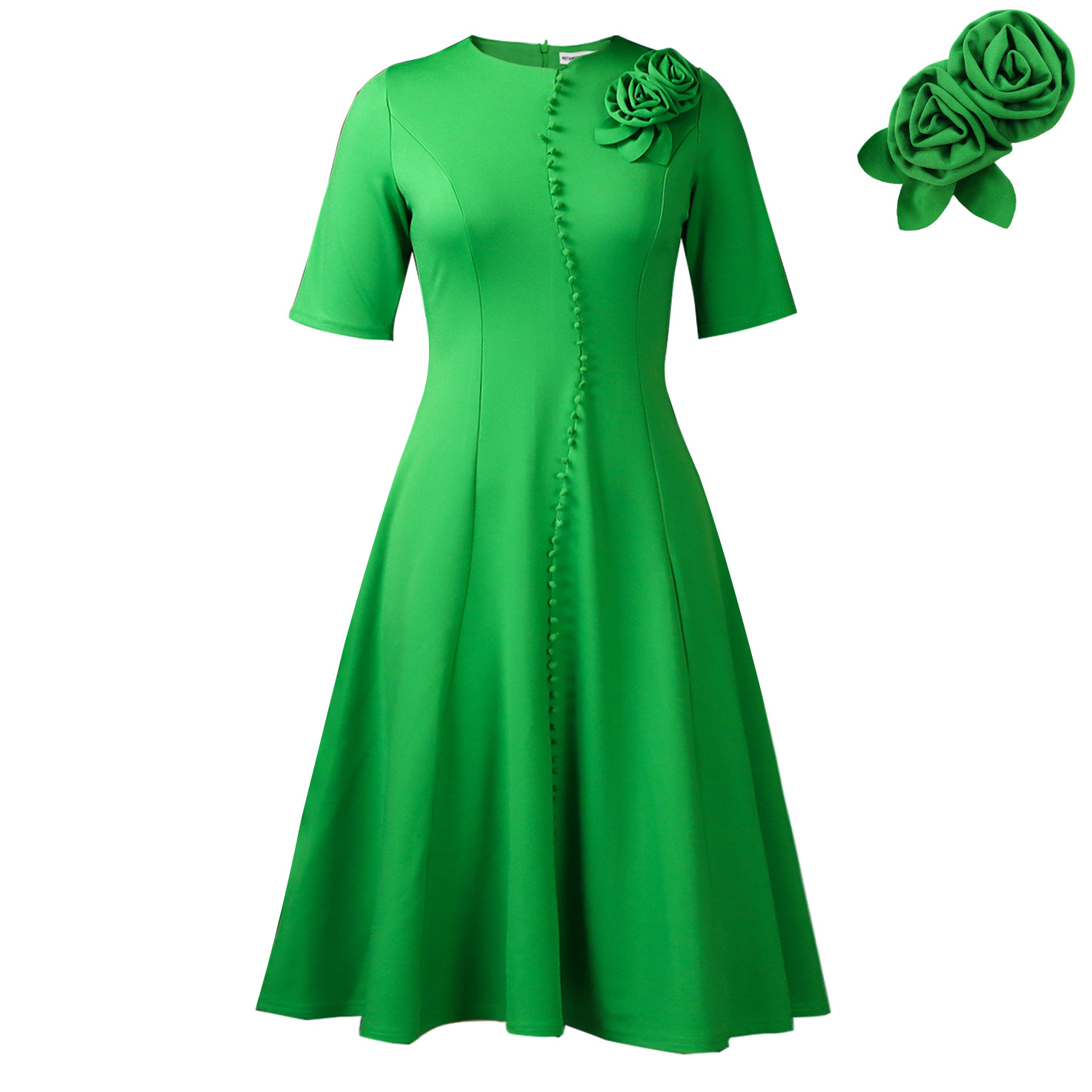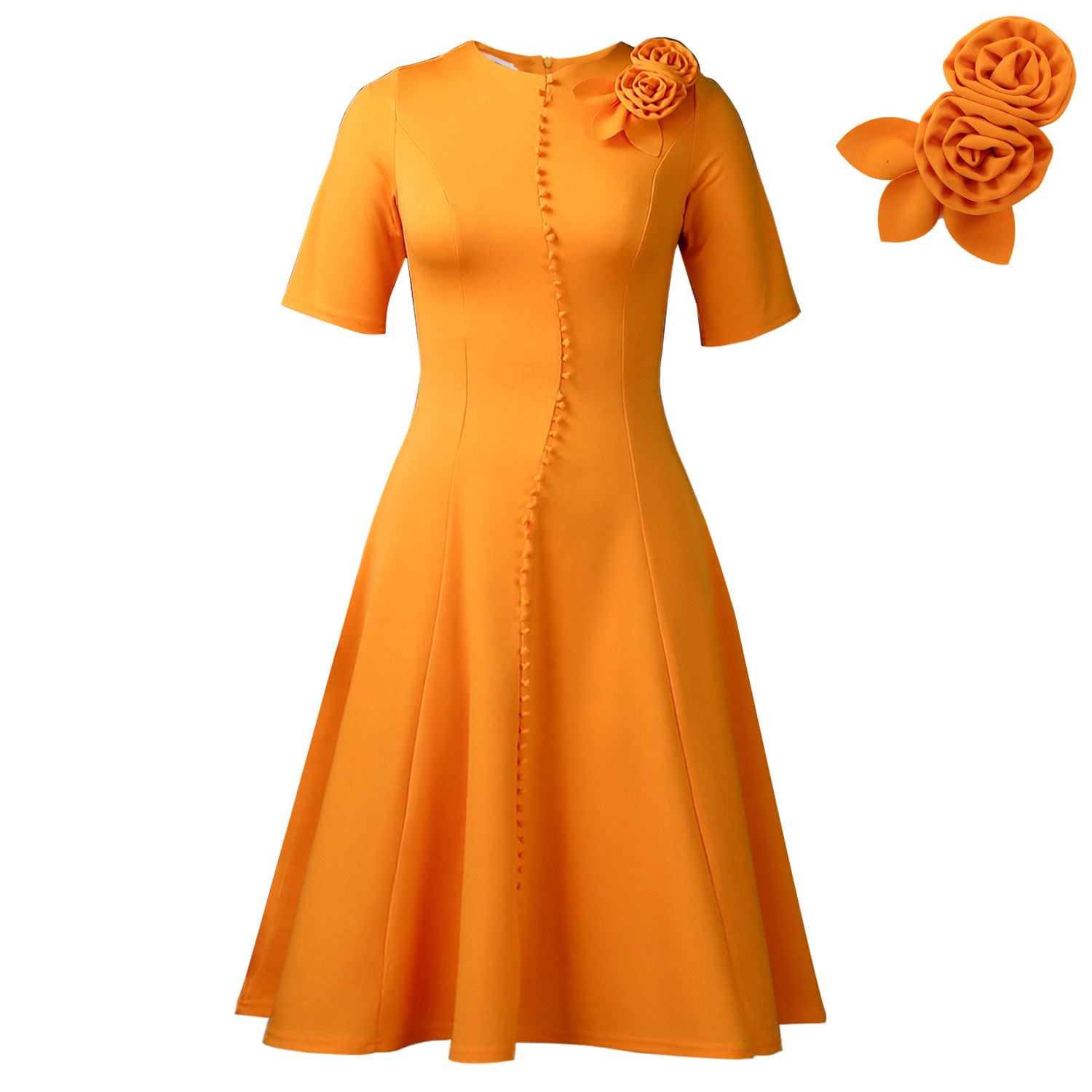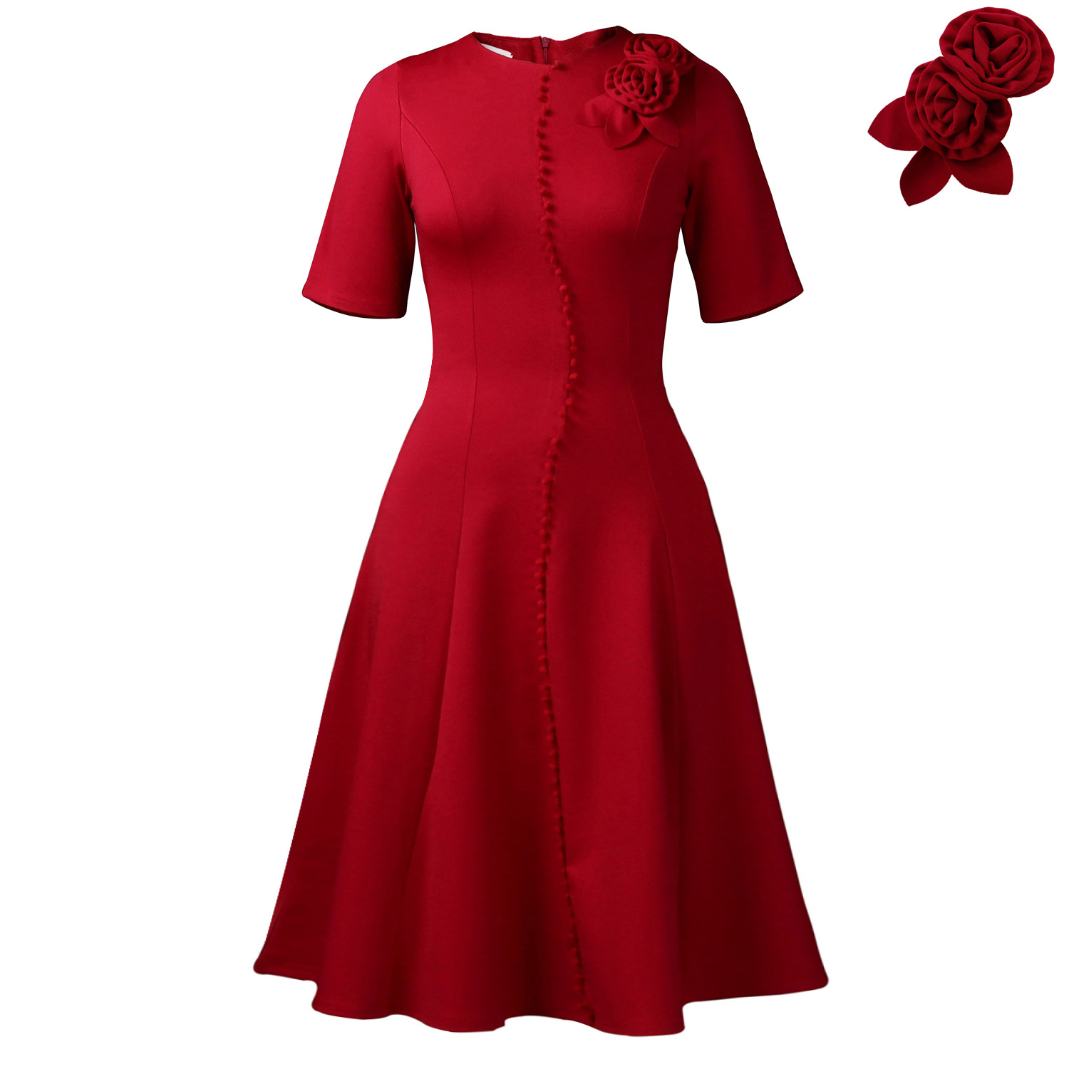 Features: A-line silhouette, high-waisted design, midi length, round neck pullover style, short regular sleeves, button accents, and optional colored brooches for decoration