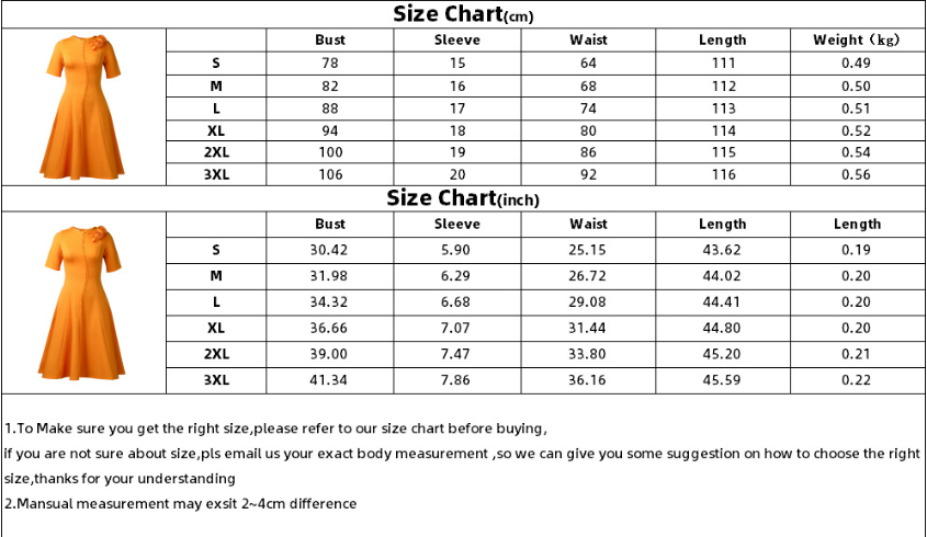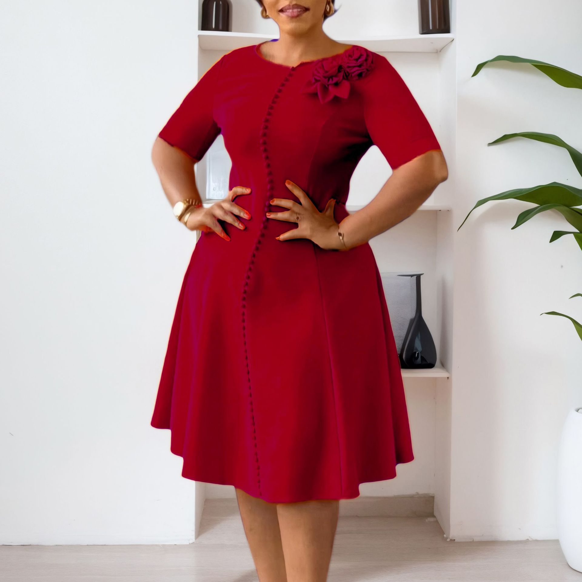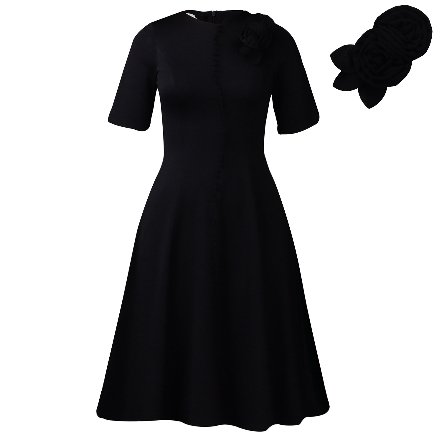 Features: A-line silhouette, high-waisted design, midi length, round neck pullover style, short regular sleeves, button accents, and optional colored brooches for decoration