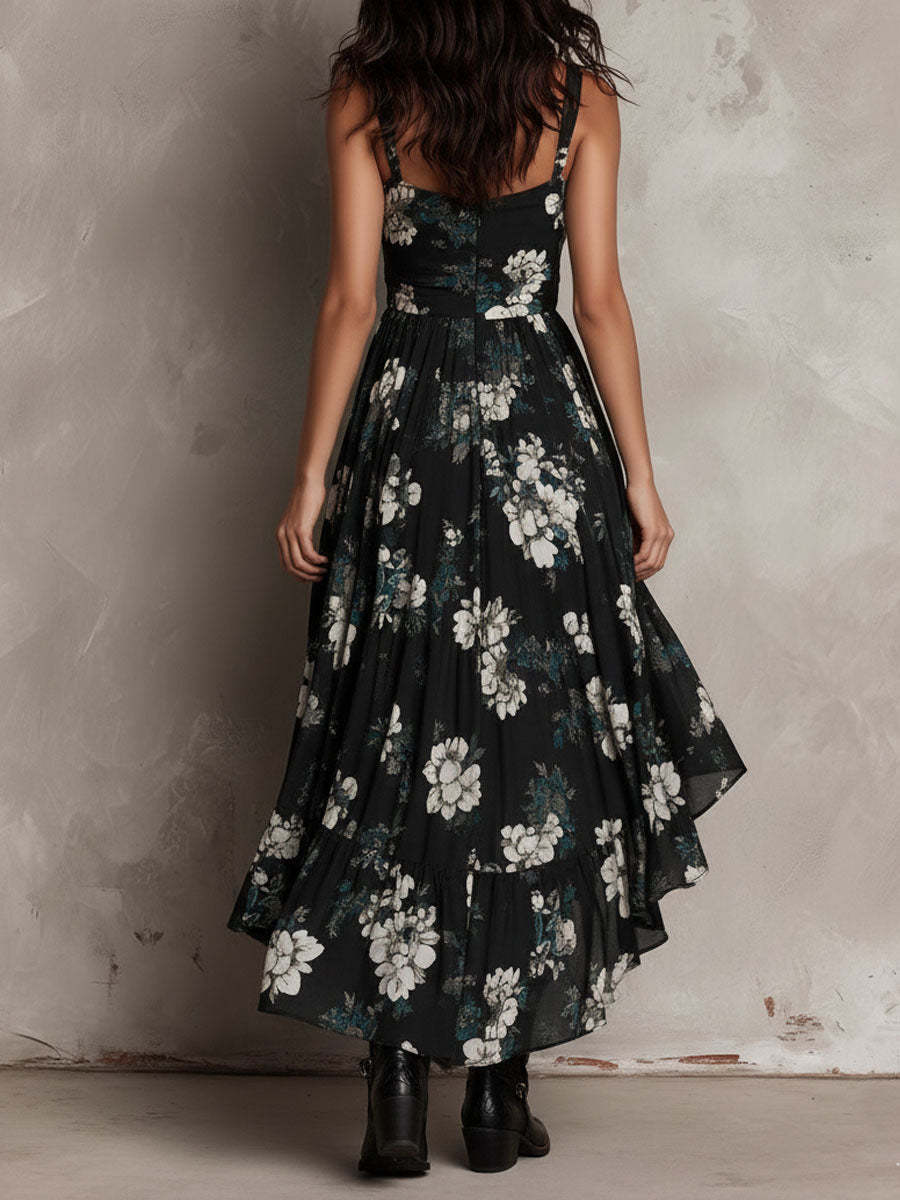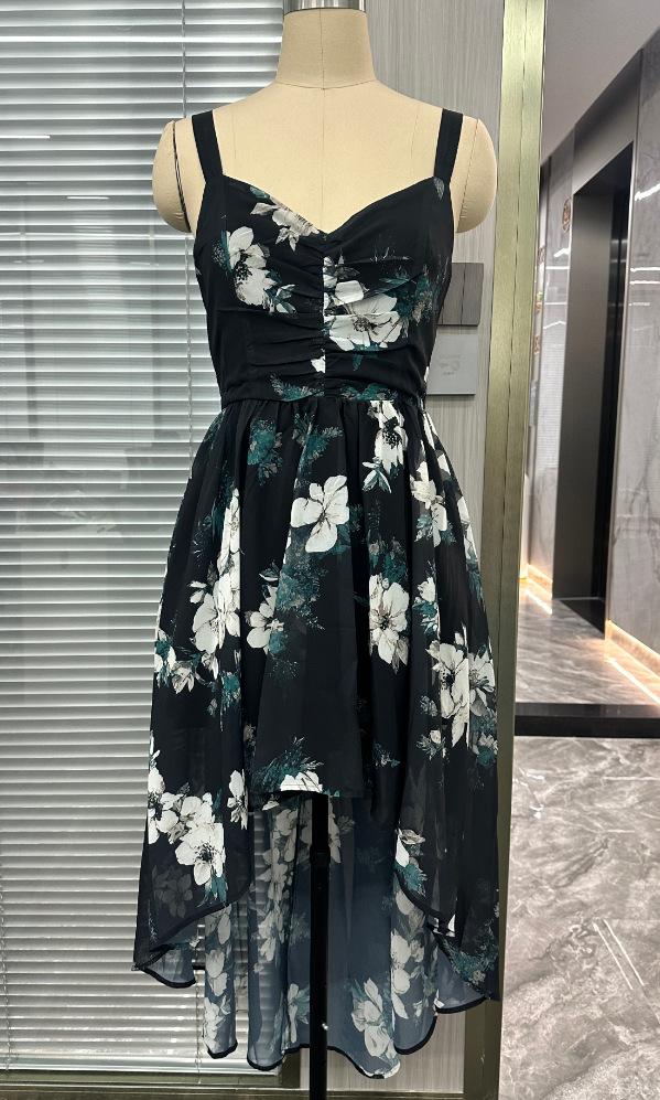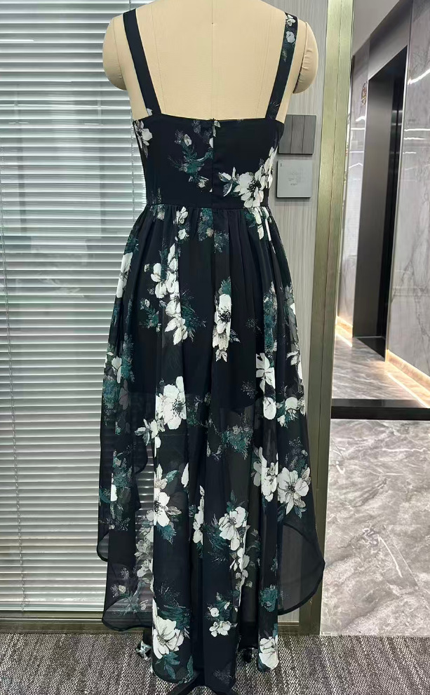 Trendy Elements: Floral Print, Printed Design, Asymmetry, Slit, Defined Waist, Pleats