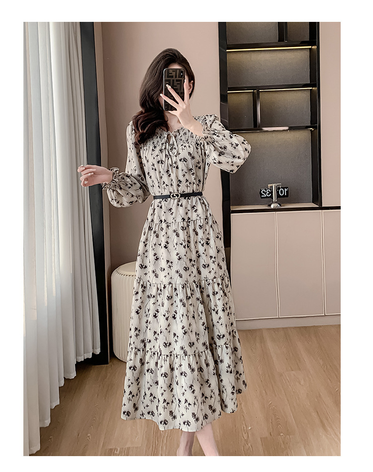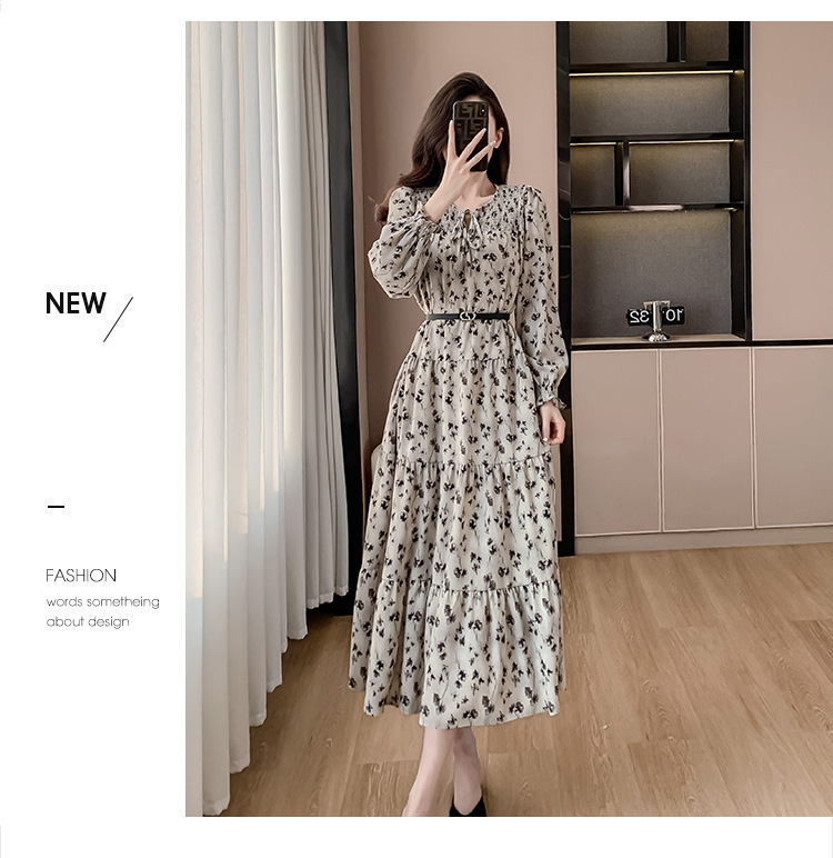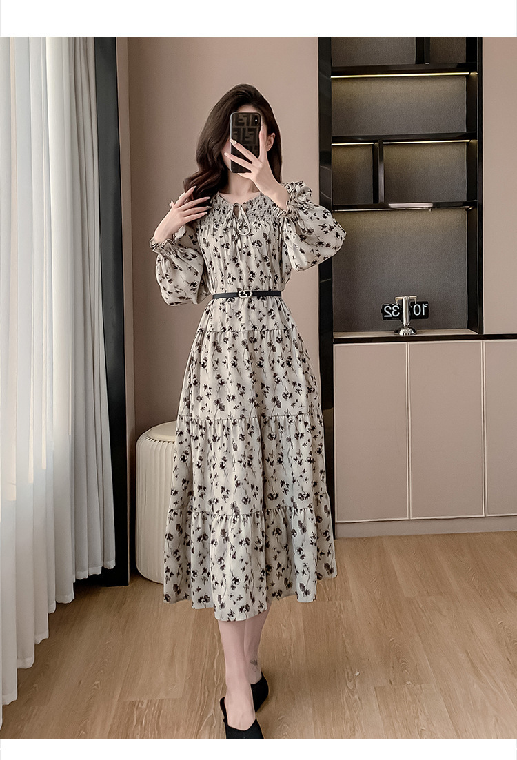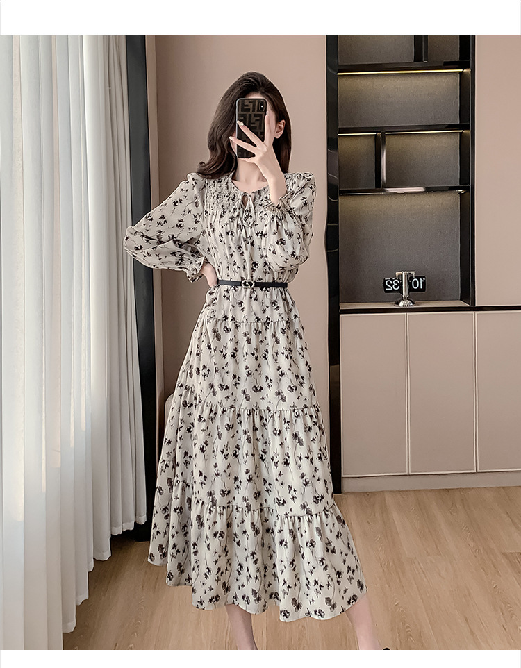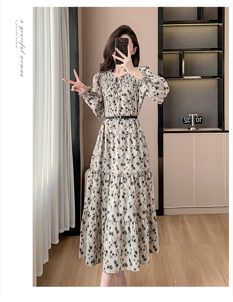 Features: Floral Print, High Waist, A-line Silhouette, Puff Sleeves, Midi Length, With Waist Belt, Digital Printing