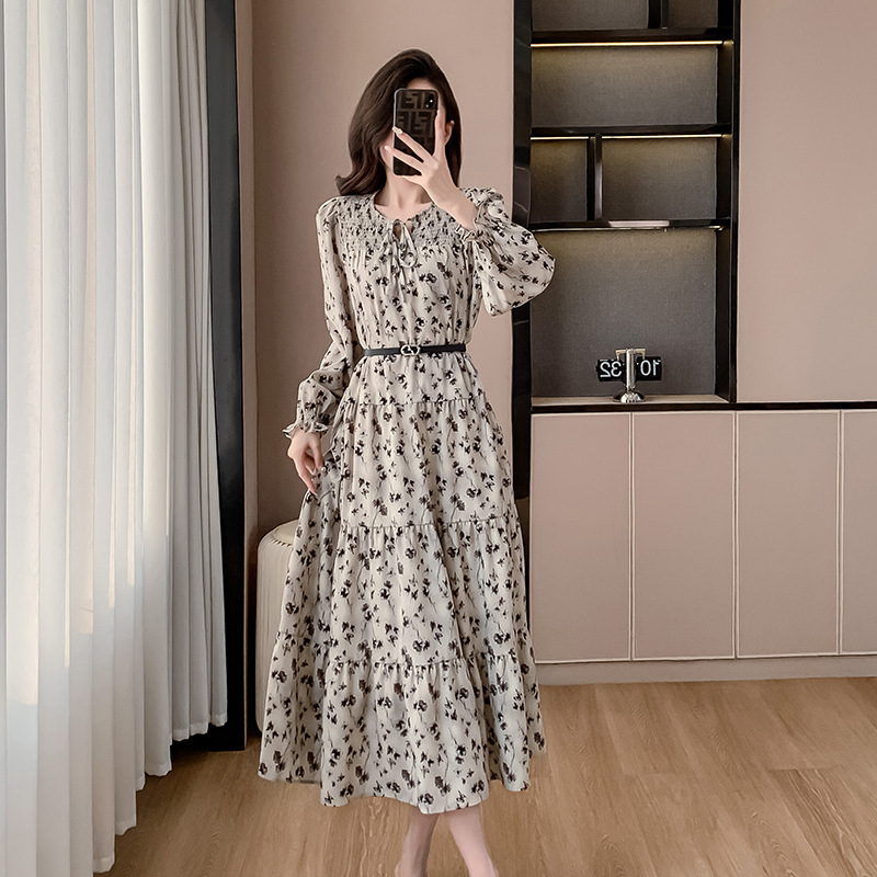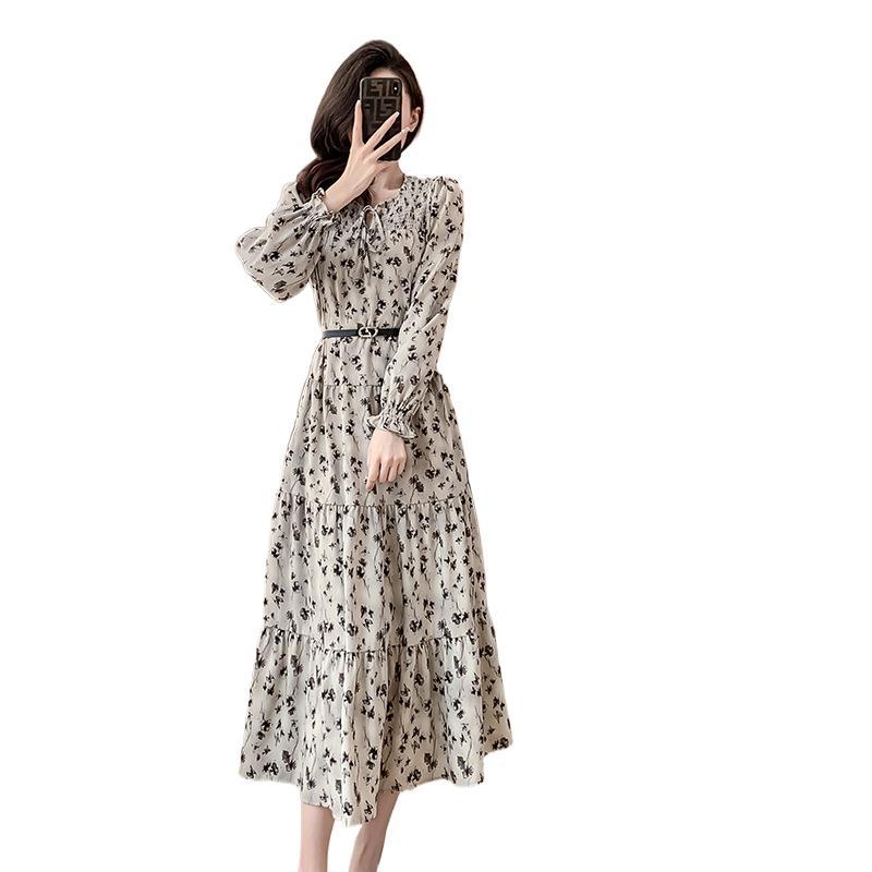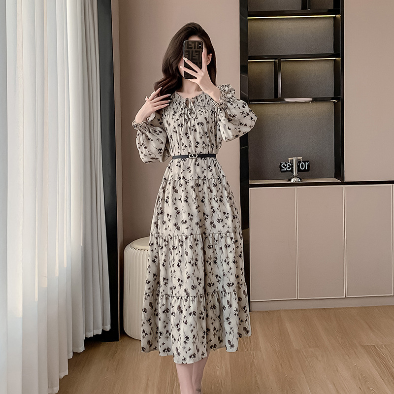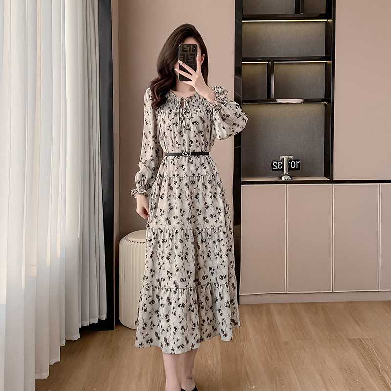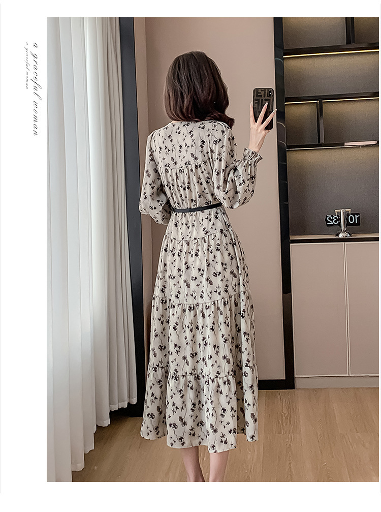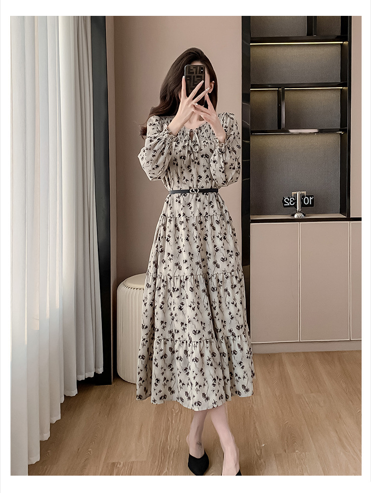 Features: Floral Print, High Waist, A-line Silhouette, Puff Sleeves, Midi Length, With Waist Belt, Digital Printing