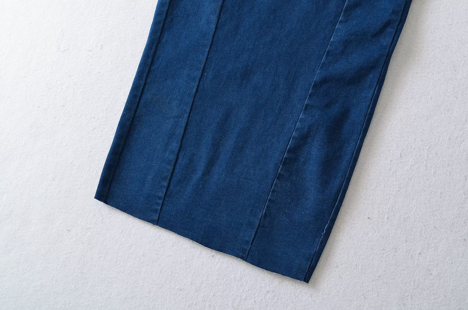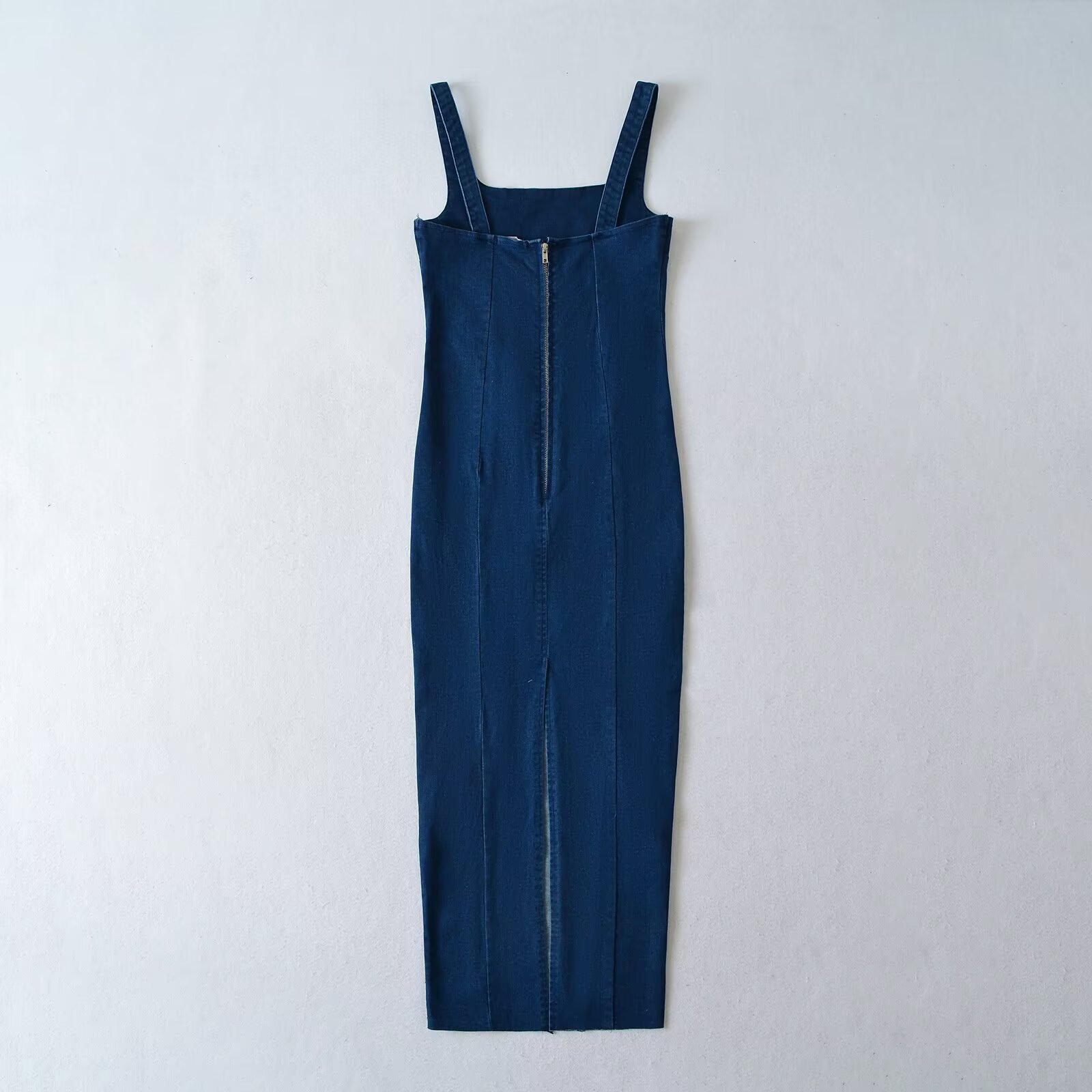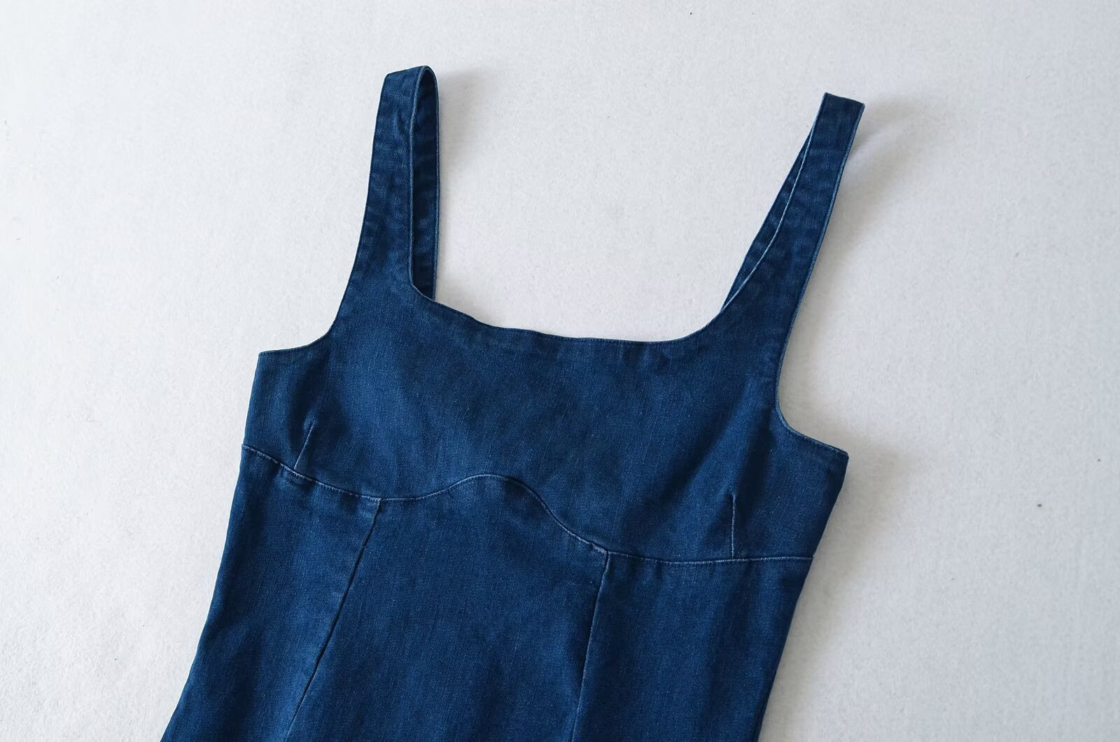Features: High waist, Off-shoulder, Sleeveless, Tank-style straps, Washed finish, Back slit, Bodycon fit