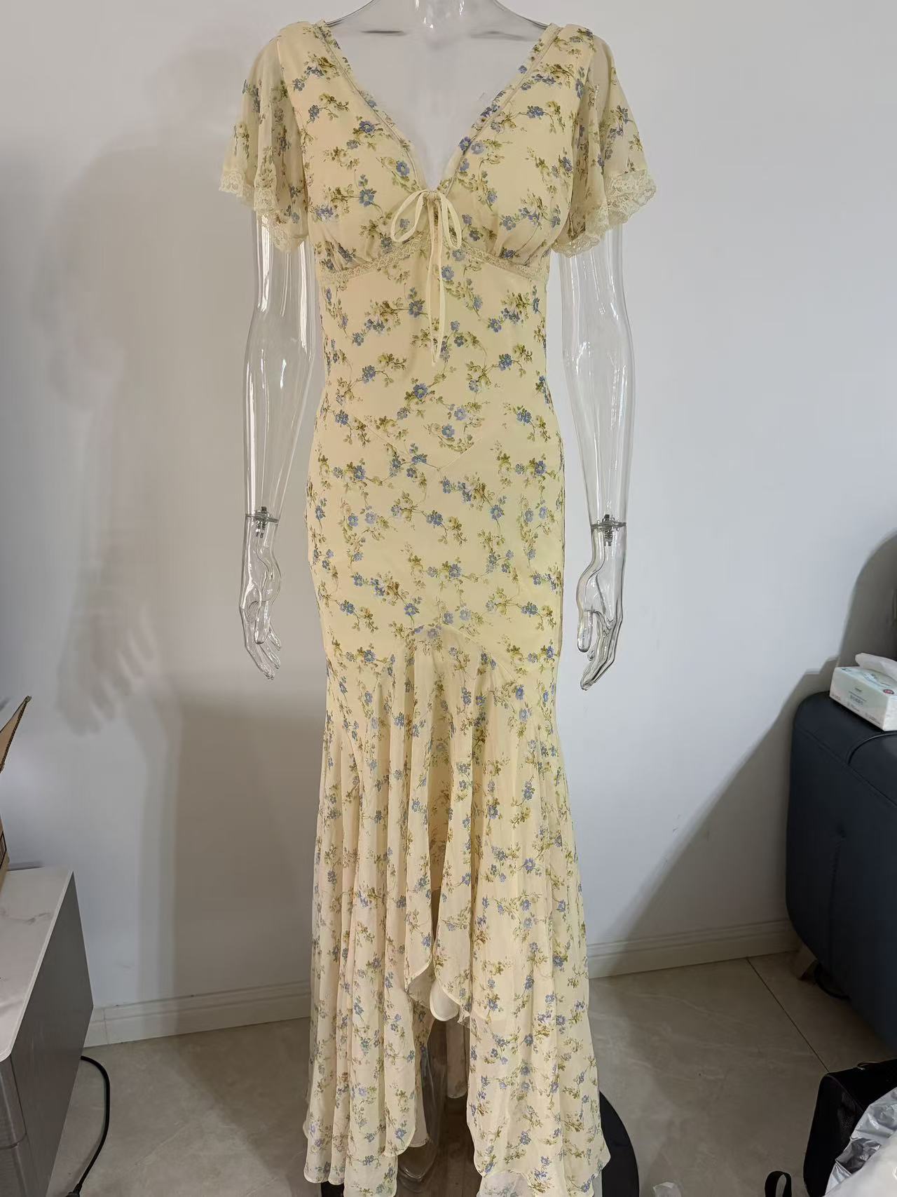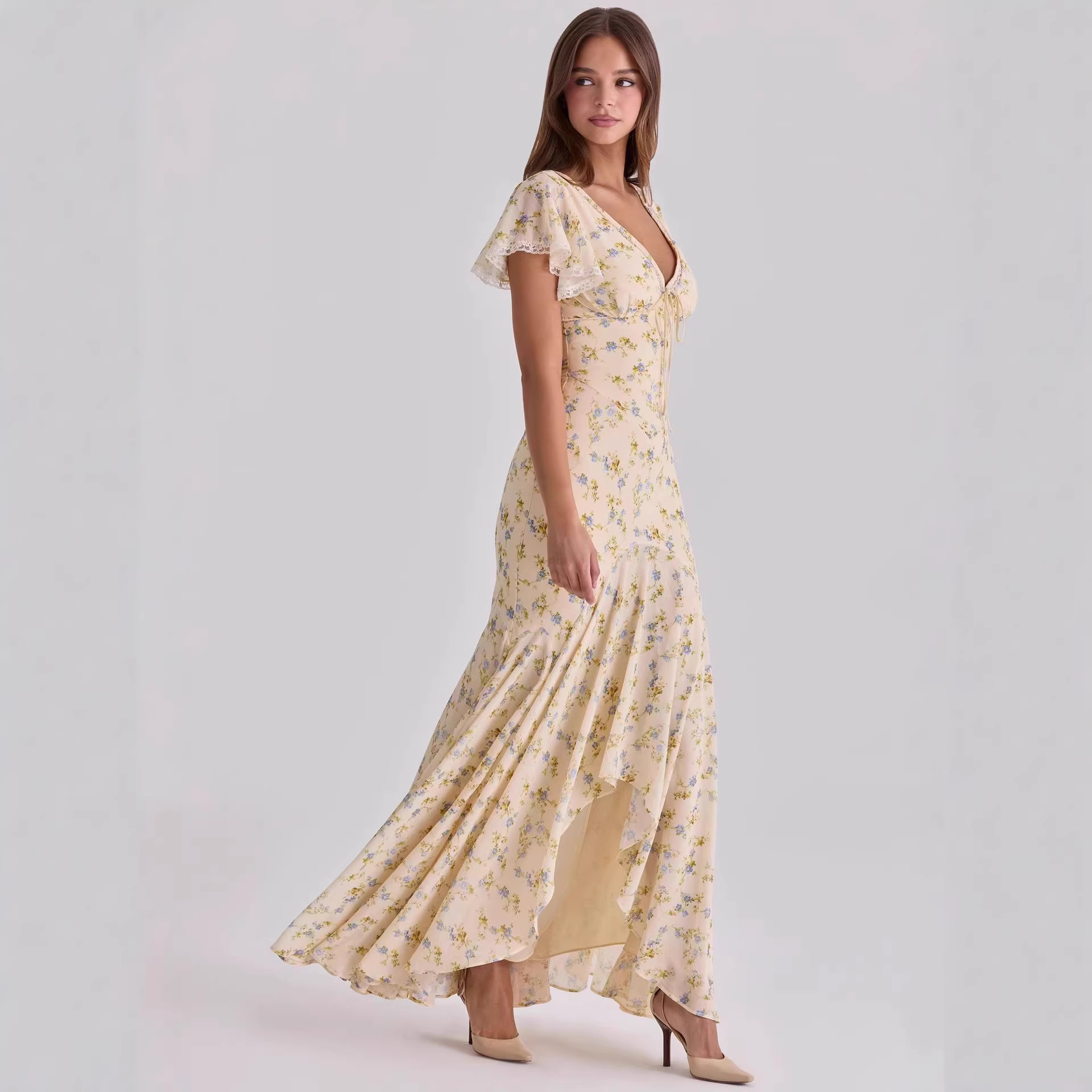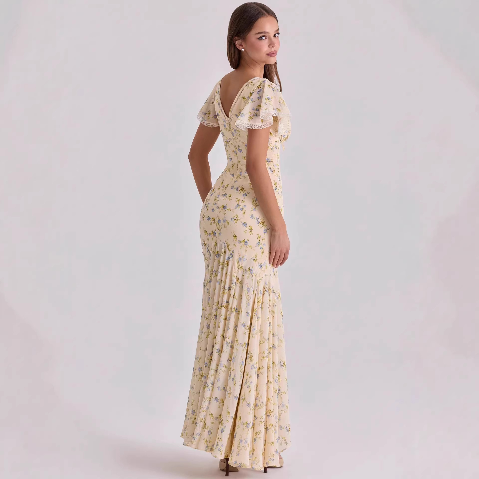 Features: Floral print, V-neck, High waist, Slim fit, Flared hem, Maxi length, Sleeveless with princess sleeve design, Double-layered construction